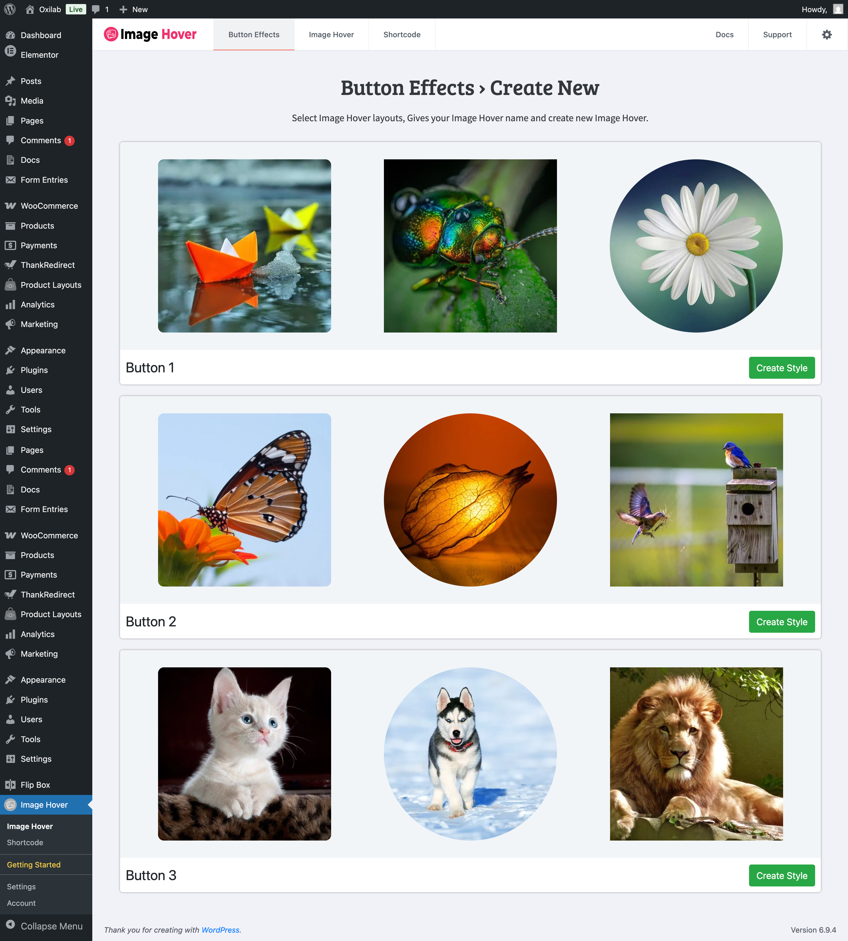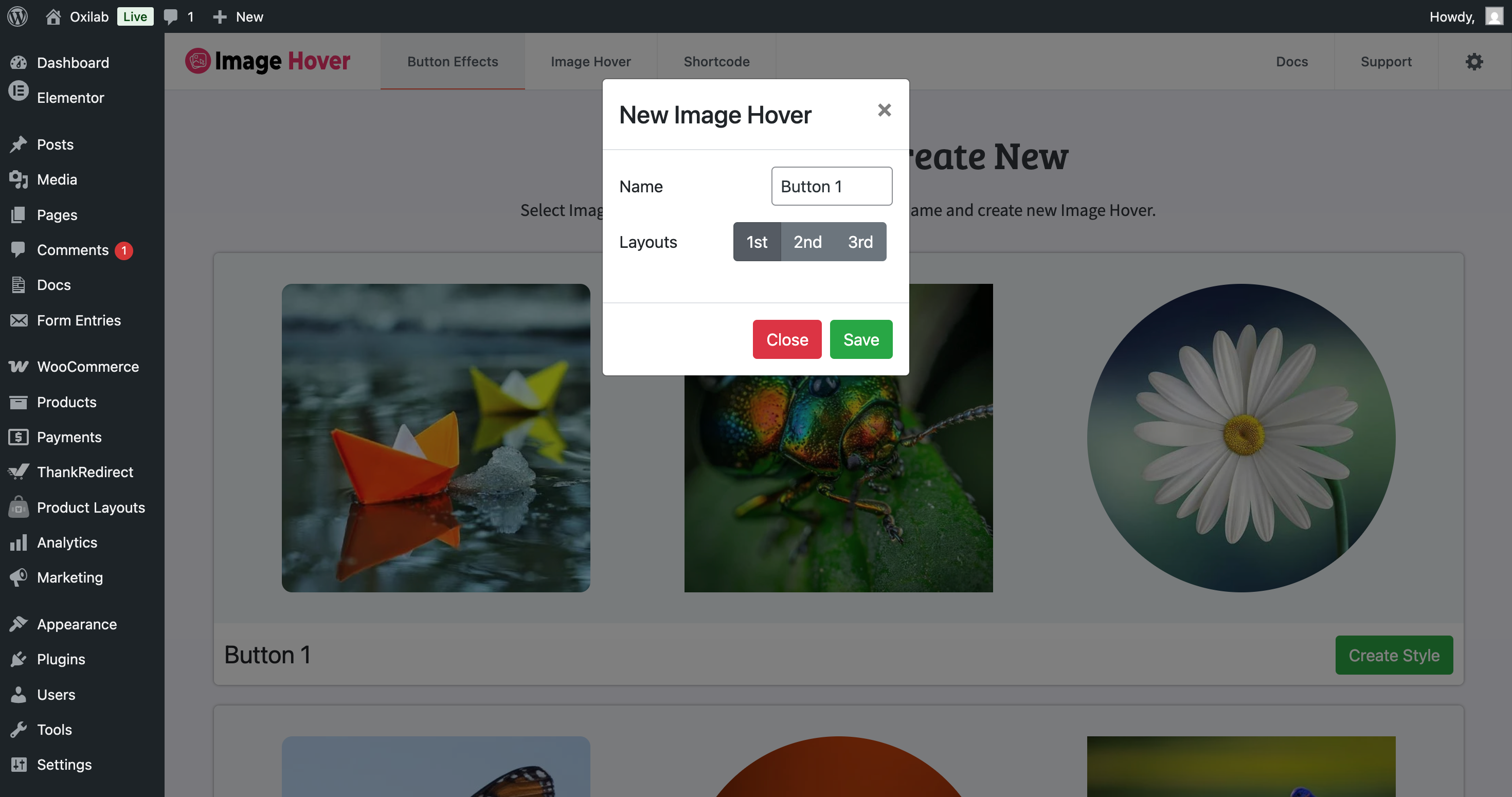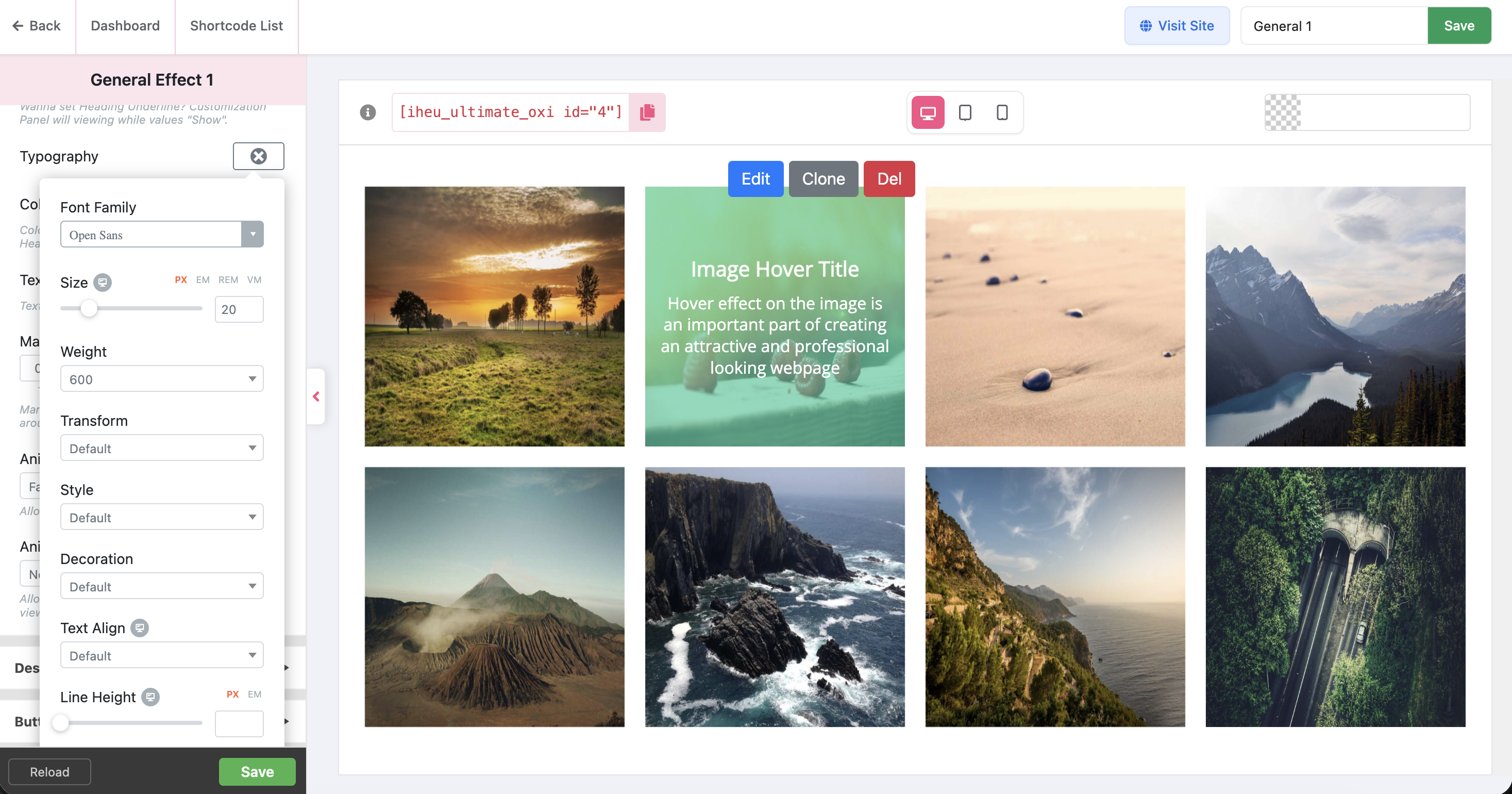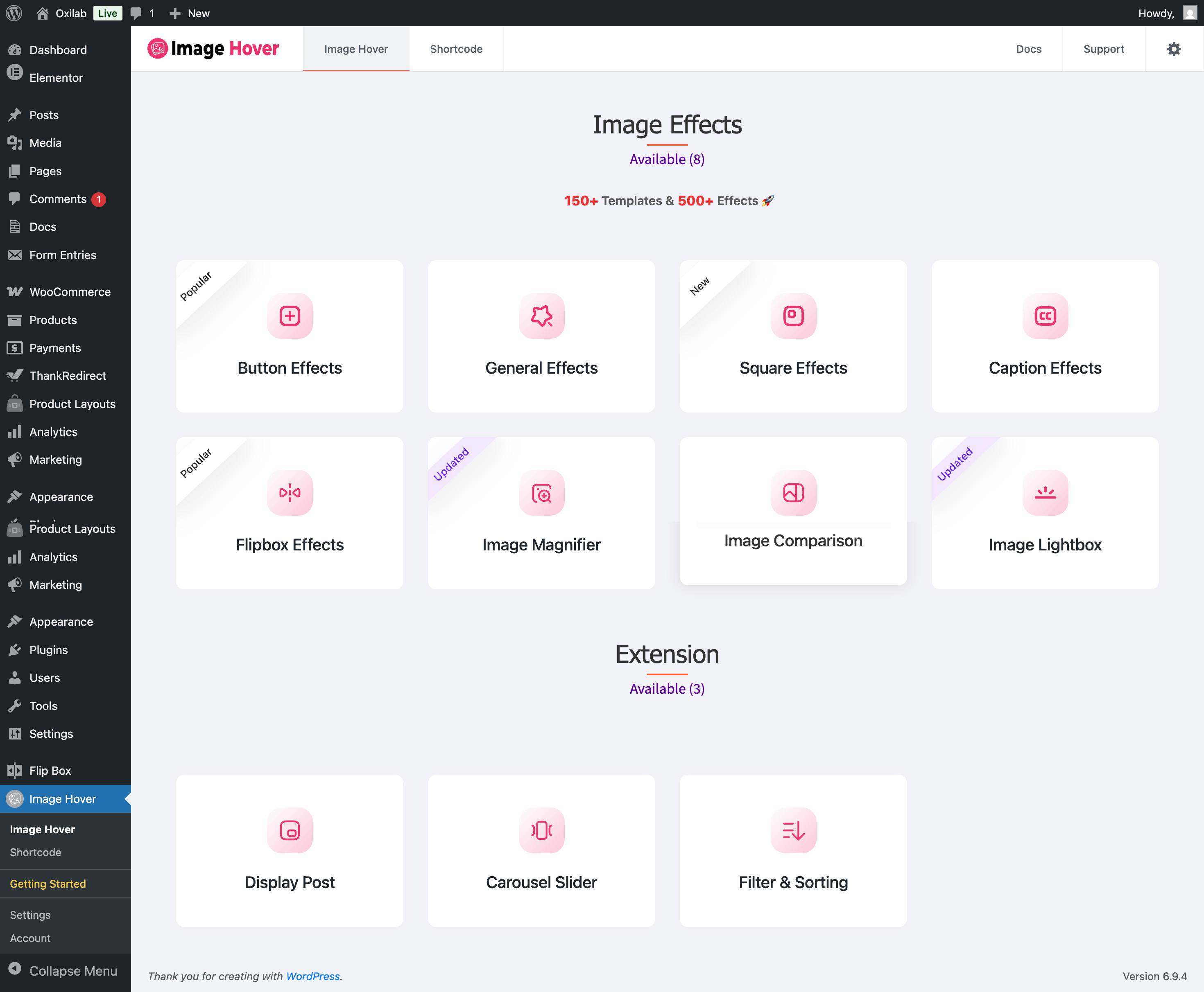 🗂️ Image Hover dashboard showing all effect modules.