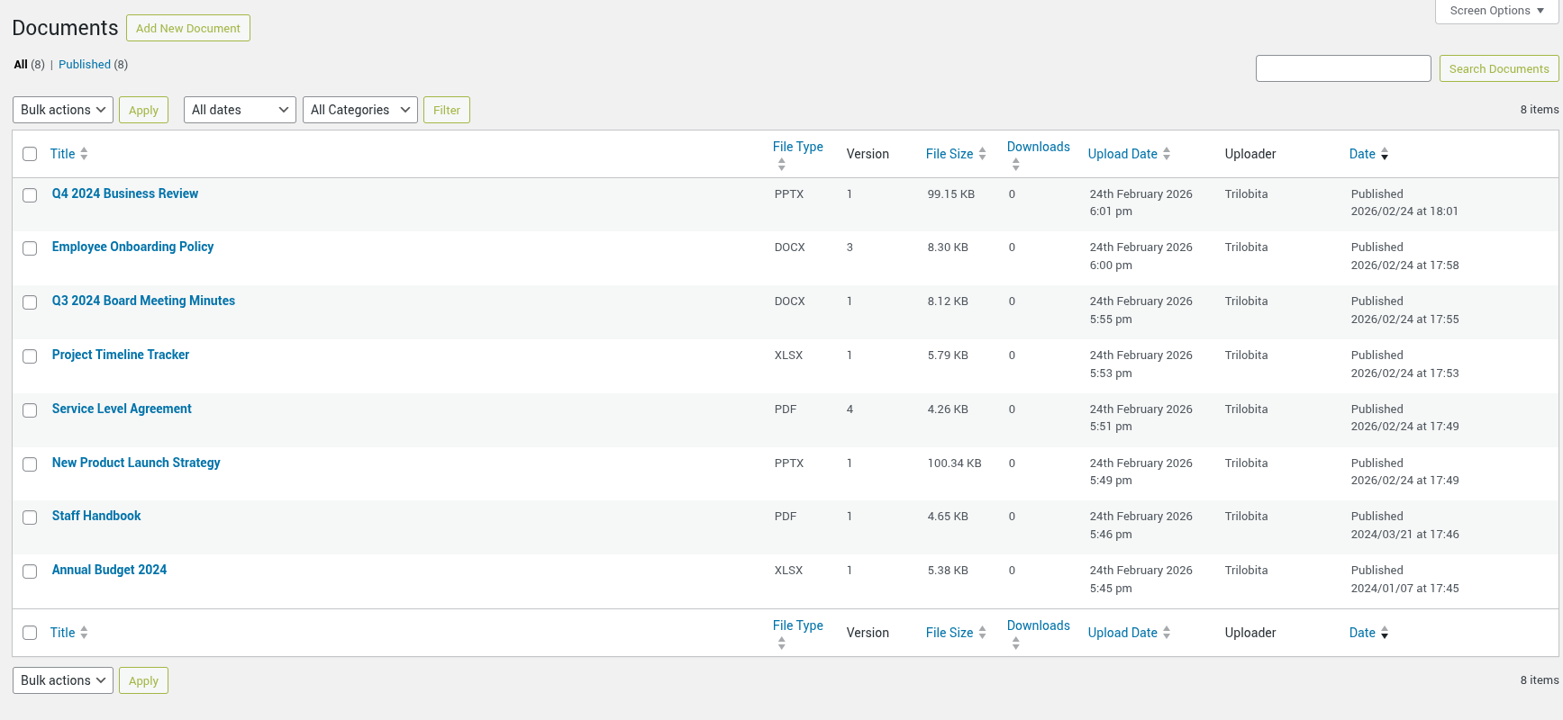 Trilobita DocVault is a WordPress document management plugin with version control and a searchable document library. Upload and organise files in the admin, then share them with your team or site visitors — with a searchable, sortable document table, Gutenberg block support, full version history, download tracking, and access control.