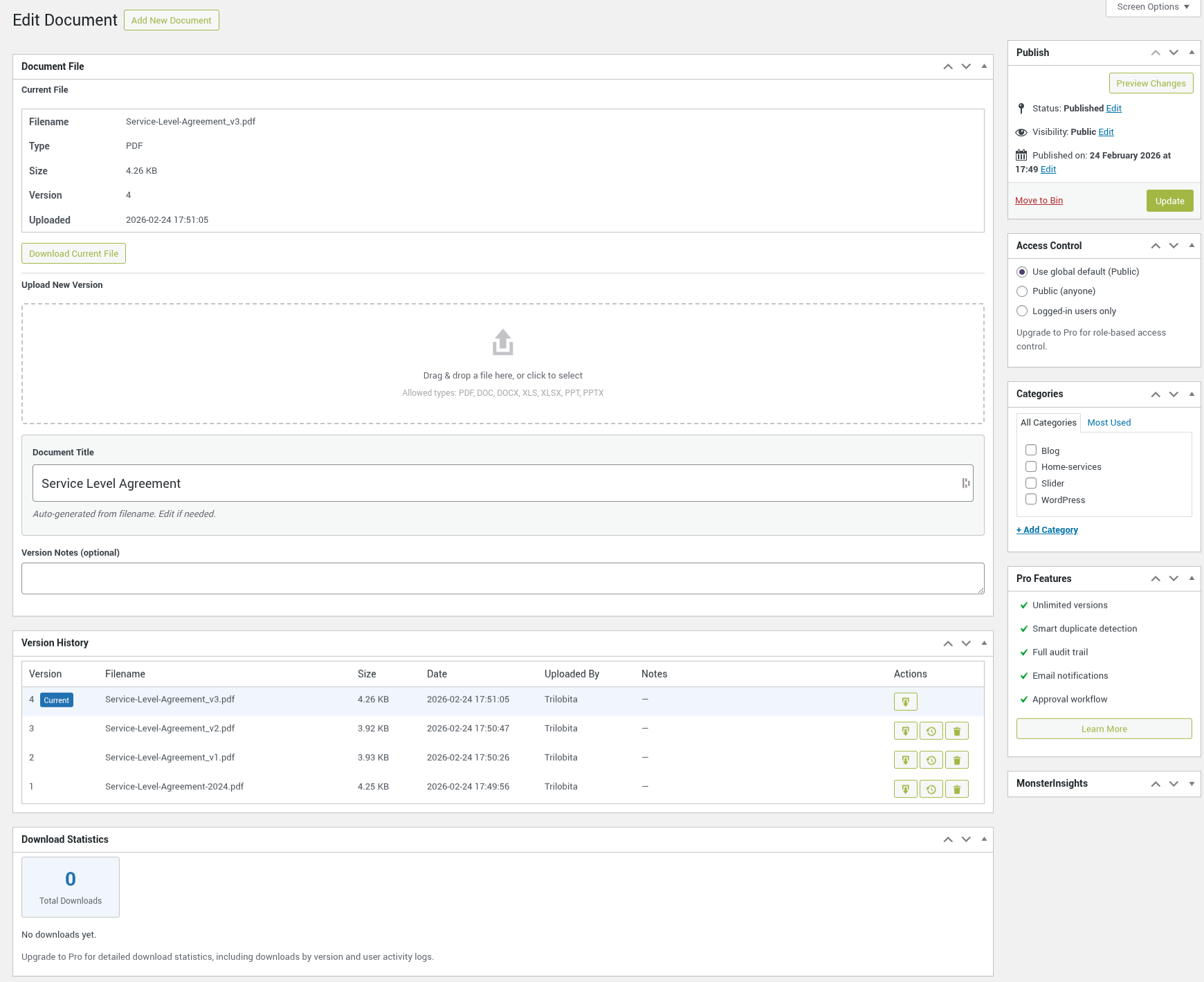 From the Edit Document screen, you can upload new versions of a file. The plugin keeps a full version history with the ability to download, restore, or delete any previous version. By default, up to 5 versions per document are kept.