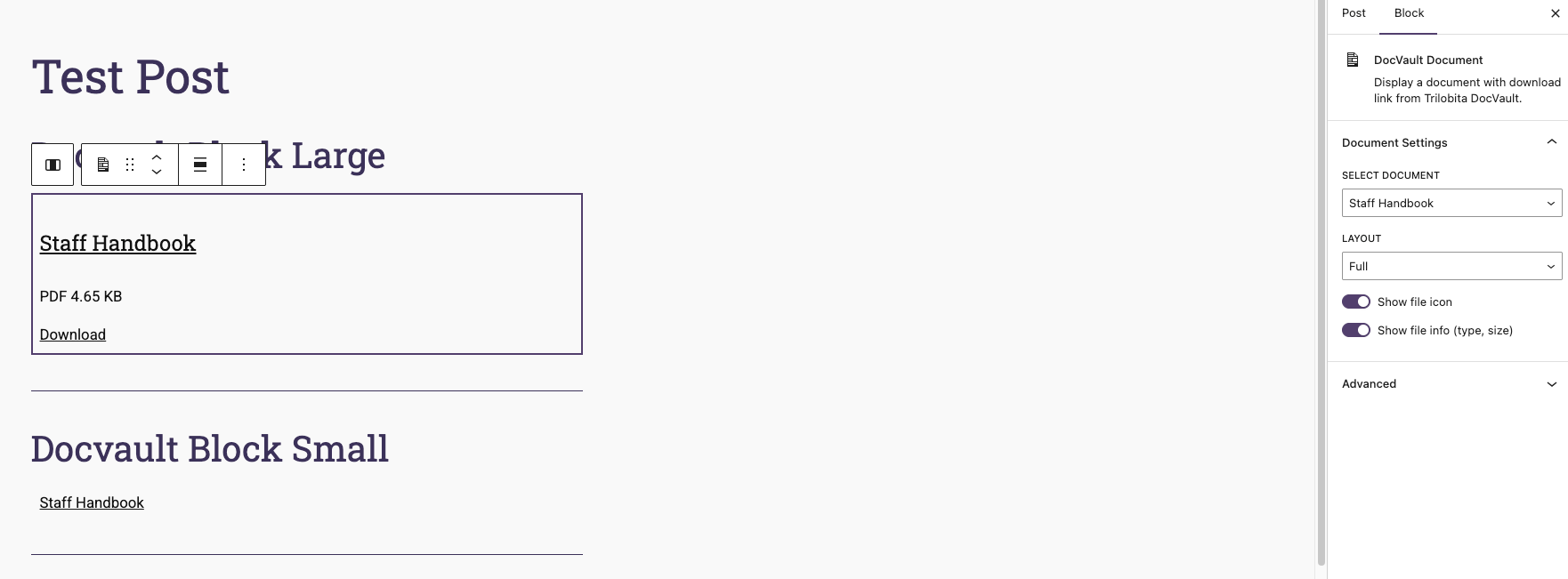 - DocVault Document block — add a single document with a download button directly in the Gutenberg block editor.