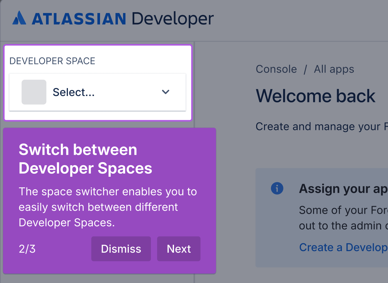 A Developer Space is a container for your Forge apps, members, and access to billing. Every new Forge app must be created in a Developer Space, and existing private apps must be linked to one. Think of it as your team’s home base for app development, where you organize, collaborate, and manage all the essentials in one place.