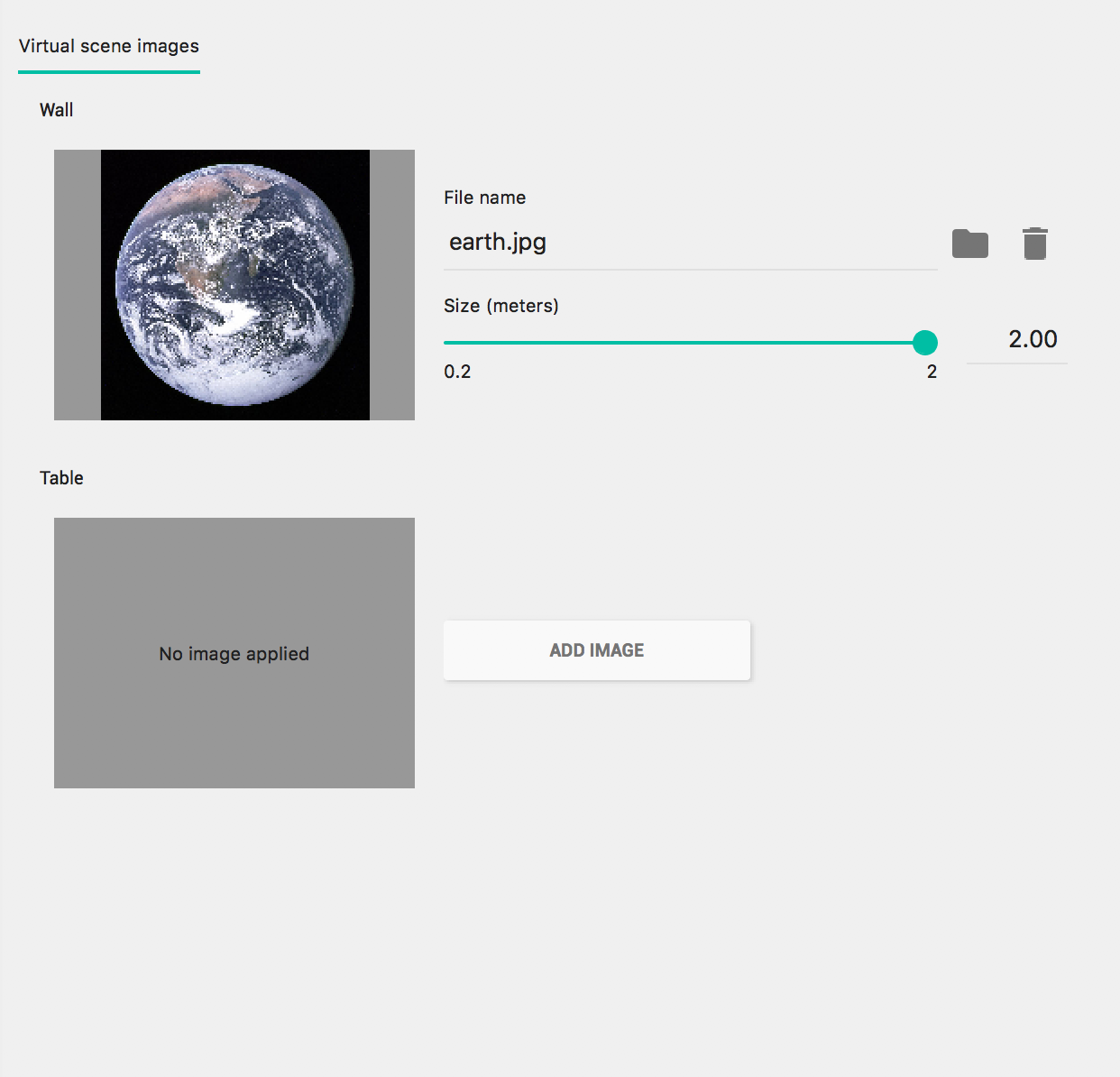 Use the Camera tab in Extended controls to add or modify Scene images. There are two image locations, one on the wall and one on the table.