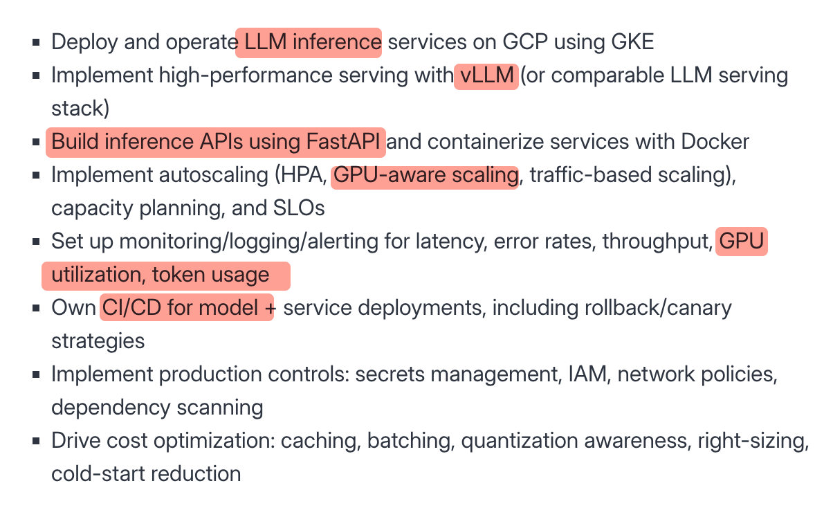 Here is the screenshot of a MLOPS engineer job description. It clearly mentions LLM inference, vLLM, building inference APIs, GPU-aware scaling, CI/CD for models, GPU utilization, token optmization etc.