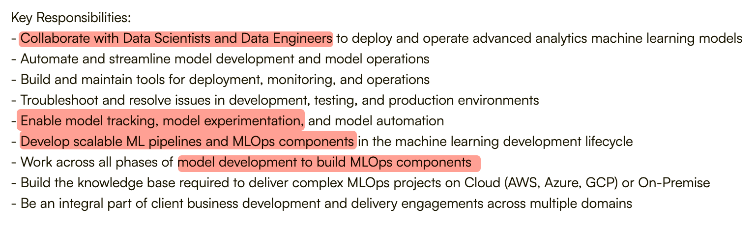 Here is another job description if MLOps engineer for traditional model deployment and management. It clearly specifies collaboration with Data Scientists and Data Engineers, ML pipelines, model tracking etc.