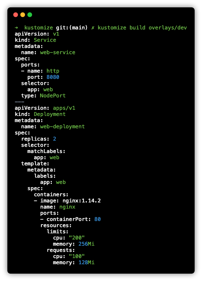 kustomize build overlays/devIt will render the below Kubernetes manifest as shown below.