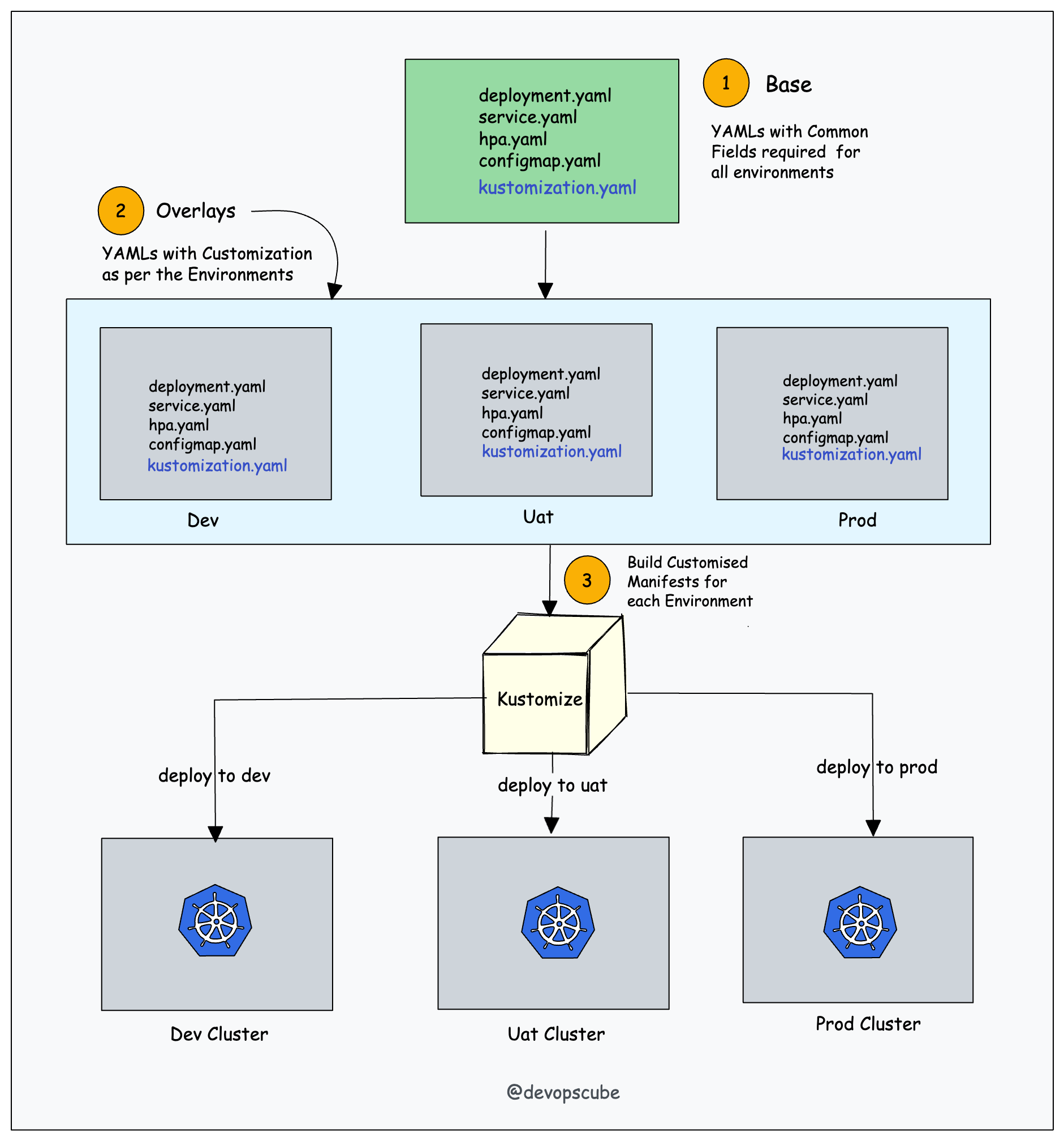 Kustomize has two key concepts, Base and Overlays. With Kustomize we can reuse the base files (common YAMLs) across all environments and overlay (patches) specifications for each of those environments.