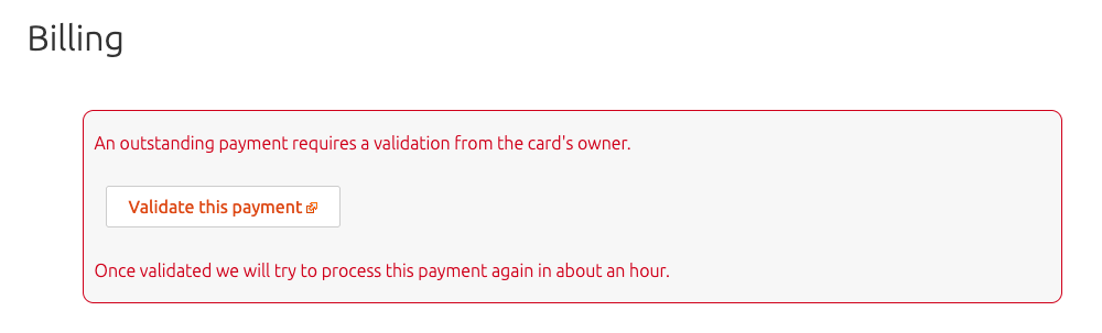 Open the link and click the link to Ubuntu Pro Dashboard. Then go to Billing and Users. There is a drop down menu. I suggest that you confirm that Payment Method is correct. In other words - credit card or debit card details.