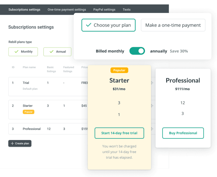 Charge agents and receive payments via PayPal, credit cards and other methods available in Woocommerce.