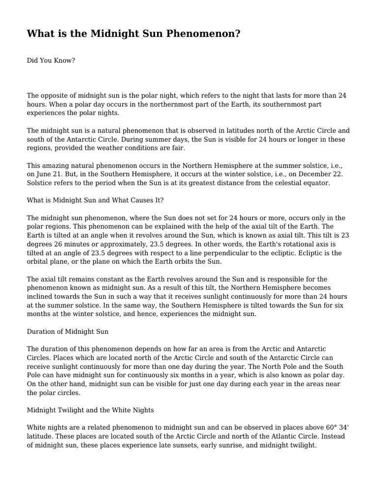 Did You Know? The opposite of midnight sun is the polar night, which refers to t