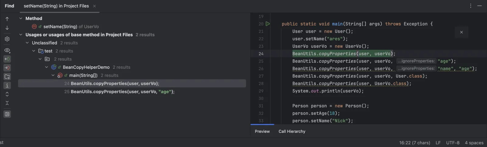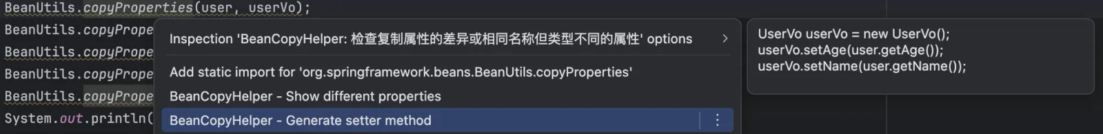 可以看到我们可以对于Getter/Setter方法或者字段使用属性复制范围查找,会认为一次Bean Copy是对源对象和目标对象同名且同类型的字段读取和写入(对于源对象来说是读取对于目标对象来说是写入)