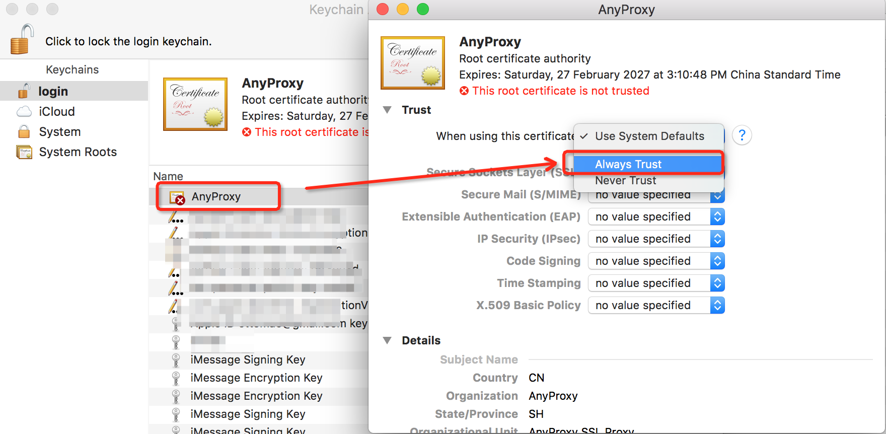 - find the newly imported AnyProxy certificates, configured as Always Trust