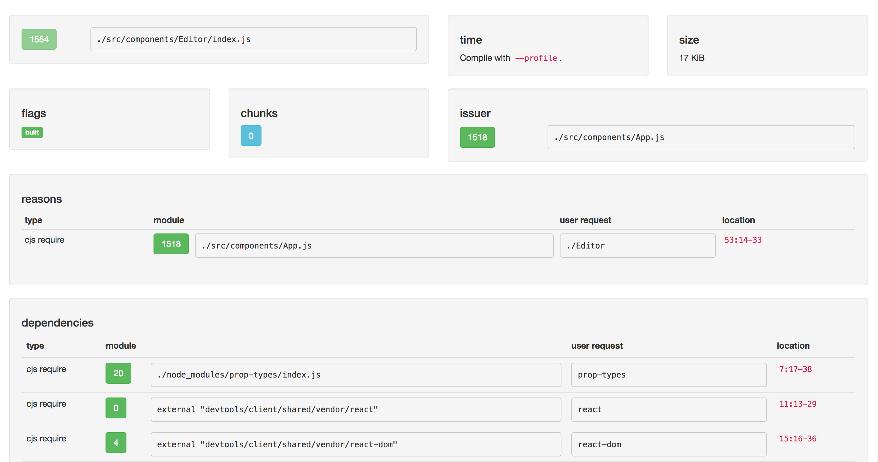 reactare excluded, they show up asexternal ...with a small byte size user-requestis a good way to see what the first request was. For instanceprop-typesresulted in./node_modules/prop-types/index.js