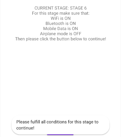 • For stage 6 user needs to turn on Bluetooth, mobile data and Wi-Fi. And turn off Airplane mode. Example of screen