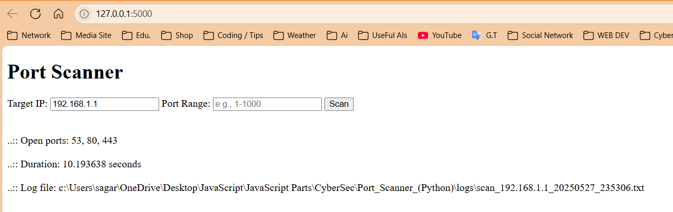 http://127.0.0.1:5000. - Enter the target IP address and optional port range, then click "Scan".