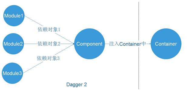 #Dagger2 基础# ##基本结构视图## Dagger2要实现一个完整的依赖注入,必不可少的元素有三种,Module,Component,Container。