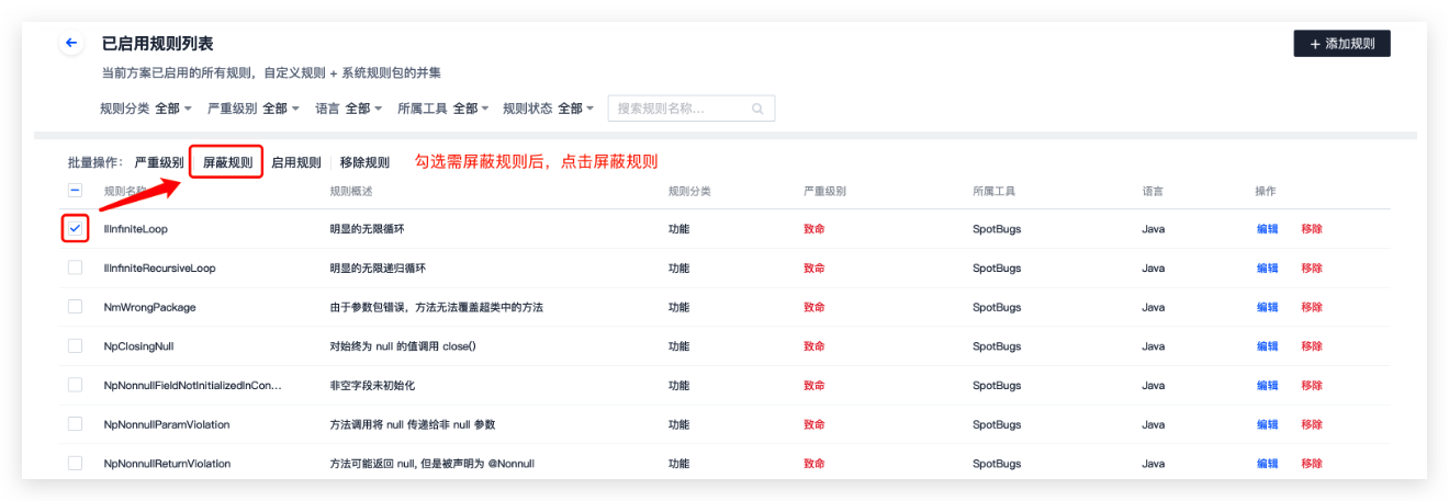- 减少不需要的规则。在扫描方案中适当屏蔽不需要的规则,按照工具维度屏蔽规则。前往「扫描方案」->「扫描规则」→「查看已启用的规则」,输入规则名称后进行移除。