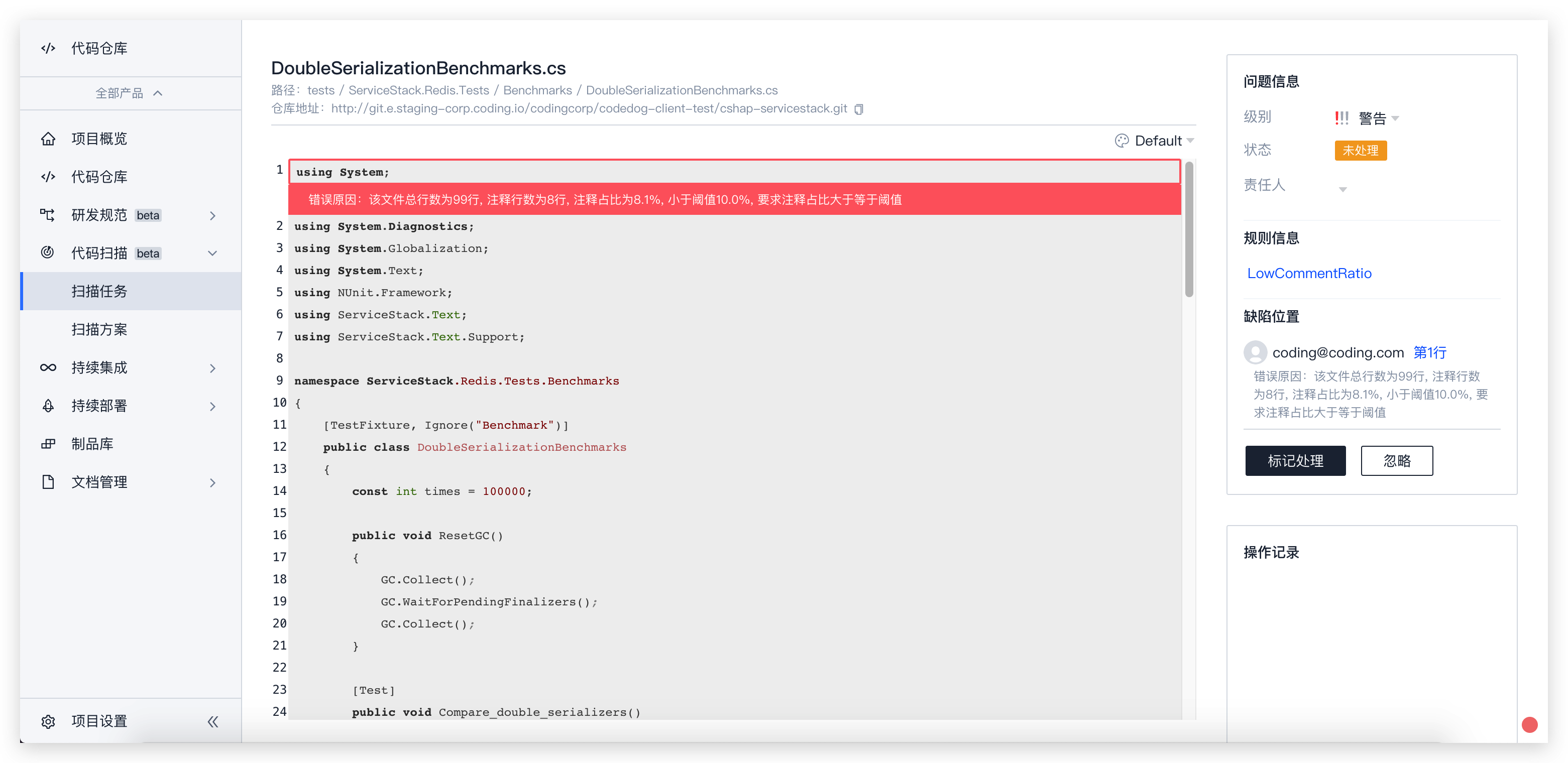 点击进入任意问题文件,可以查看问题代码详情,一个文件内的同一规则的问题将聚合在一起展示。问题详情视图右侧将展示问题信息和该问题的操作记录以及该缺陷的位置。