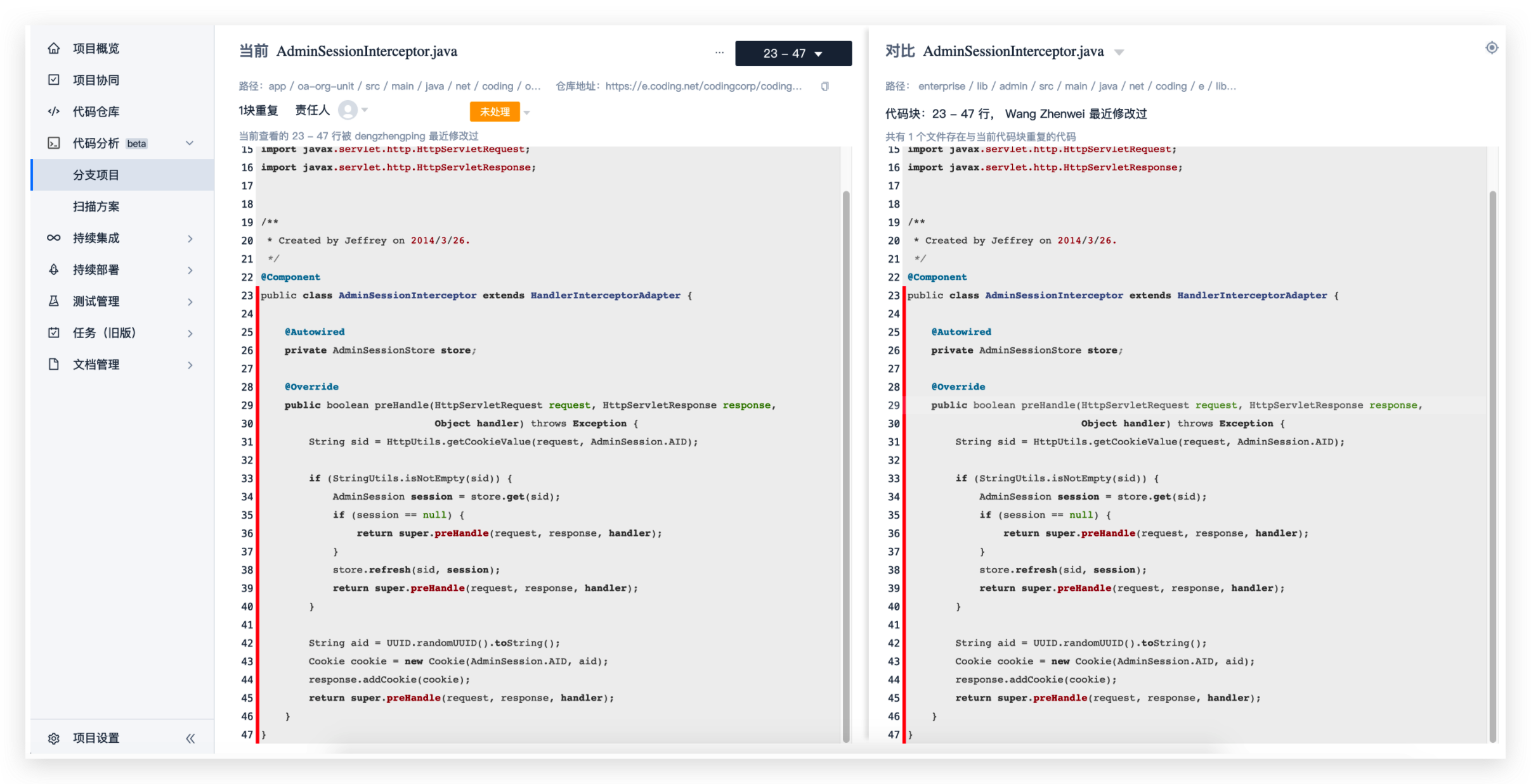 在重复代码页中将会对重复的代码块有特殊标注,点击红色区域还可以选择两个文件进行对比。