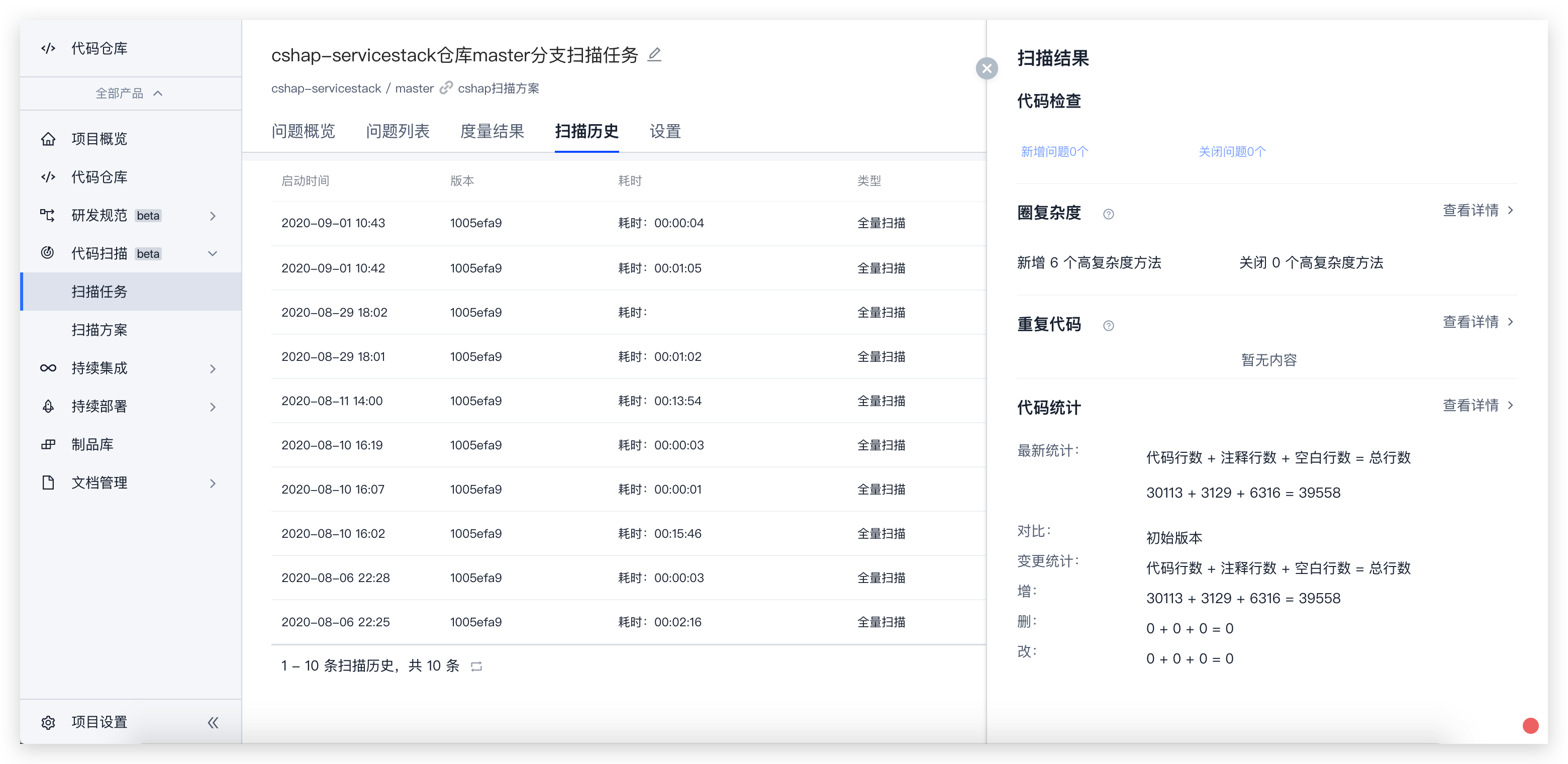 扫描结果将会展示本次扫描在代码检查和代码度量上的变化情况,可以查看新增 / 关闭的问题、圈复杂度超标方法、重复代码的变化以及代码统计的结果。