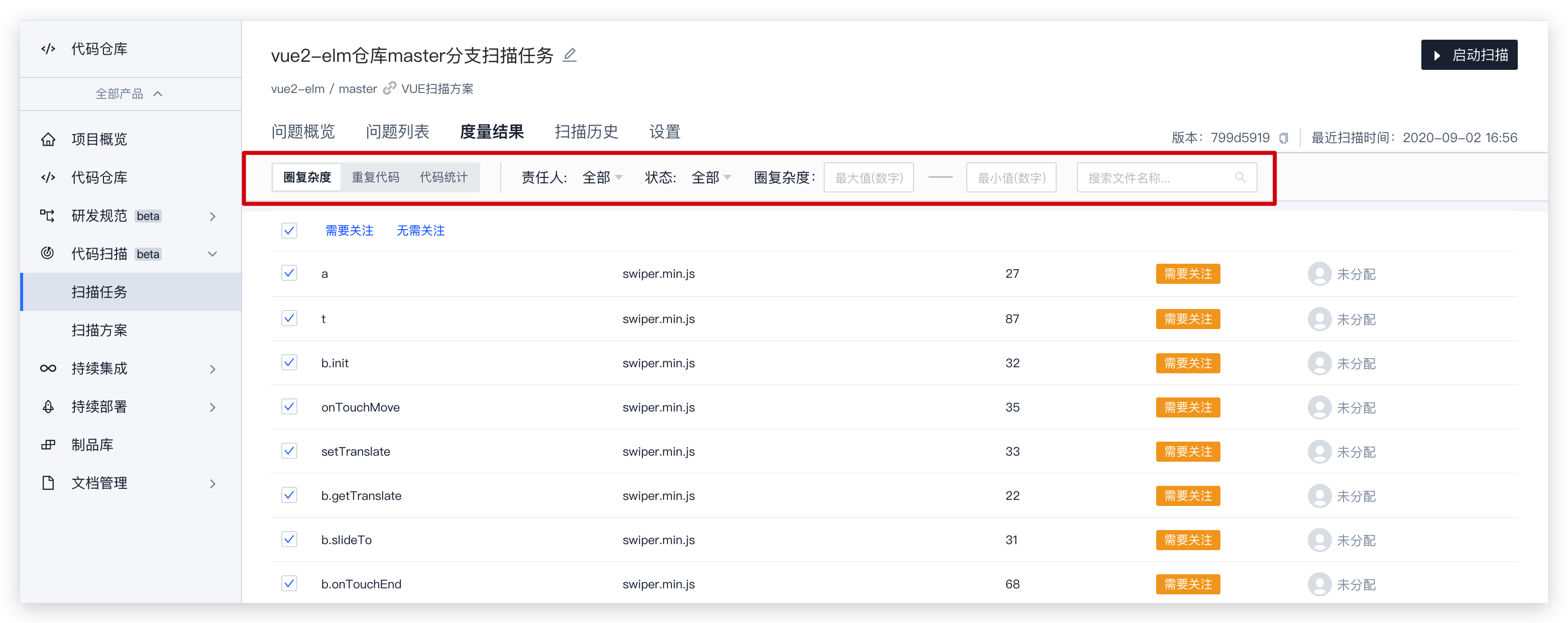 进入扫描任务后会显示当前项目中所有由用户主动创建、持续集成自动生成的扫描任务。筛选器支持代码仓库与代码分支的筛选,搜索框中支持按照扫描任务名称搜索。