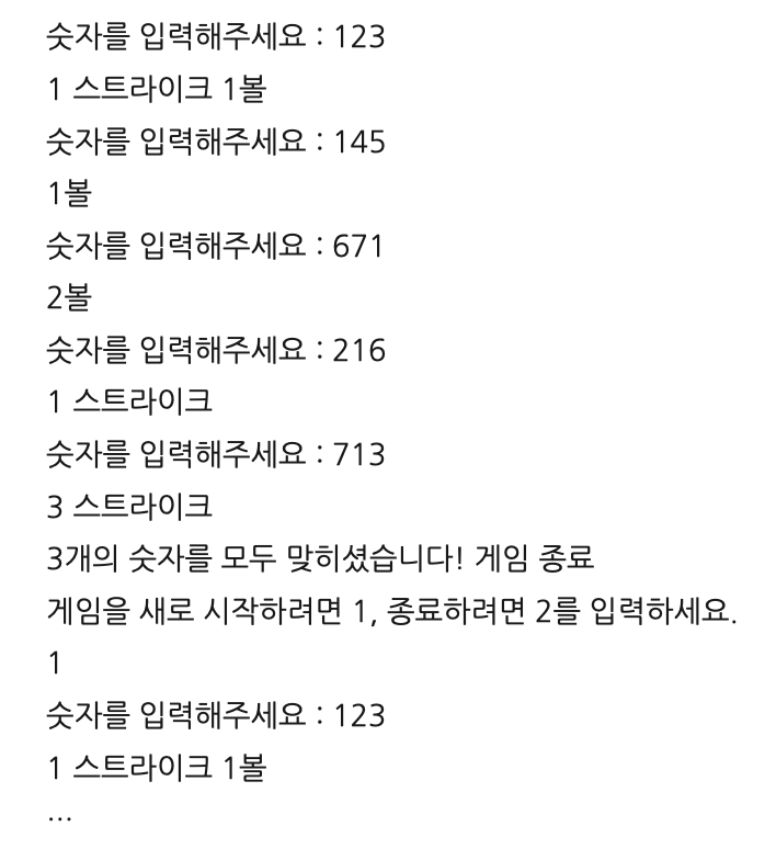 - (예1) 상대방(컴퓨터)의 수 : 123, 사용자입력 : 456 인 경우 낫싱 - (예2) 상대방(컴퓨터)의 수 : 123, 사용자입력 : 159 인 경우 1스트라이크 - (예3) 상대방(컴퓨터)의 수 : 123, 사용자입력 : 321 인 경우 1스트라이크 2볼 - (예4) 상대방(컴퓨터)의 수 : 123, 사용자입력 : 123 인 경우 3스트라이크 -