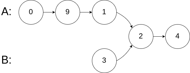 输入解释:相交节点的值为 2 (注意,如果两个列表相交则不能为 0)。从各自的表头开始算起,链表 A 为 [0,9,1,2,4],链表 B 为 [3,2,4]。在 A 中,相交节点前有 3 个节点;在 B 中,相交节点前有 1 个节点。示例 3:
