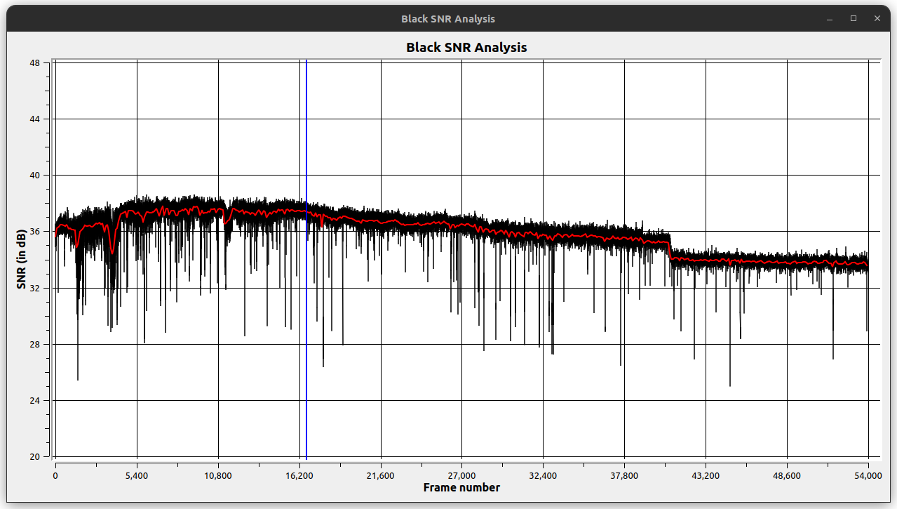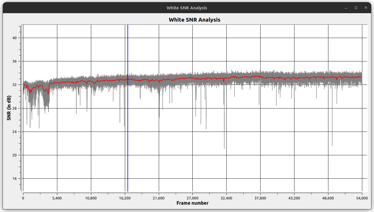 White SNR signal analysis is similar to black SNR however, the measurement is taken at the white IRE video point rather than the black. White SNR is a measure of signal quality but is less important (in general) than the black SNR result (since noise at the white level has generally less visible effect on the overall image):