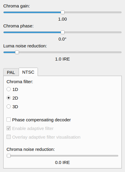 The ‘Chroma filter’ radio betters let you choose between three different chroma filters, corresponding to ntsc1d, ntsc2d and ntsc3d at the command line. The 1D decoder is a simple notch filter, producing very poor quality output. The 2D decoder is an adaptive 3-line decoder that uses a heuristic to combine information from adjacent lines within a single field. The 3D decoder uses a heuristic that combines information from lines across five fields. 3D will give the best results, particularly for material like animation that often has repeated content between fields, but it’s much slower than 2D.