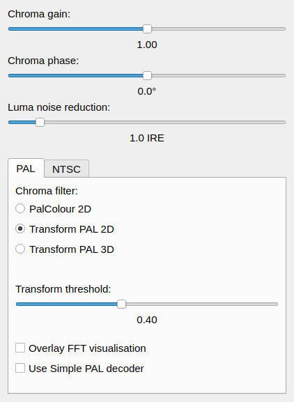 The ‘Chroma filter’ radio buttons let you select between three different chroma filters, corresponding to pal2d, transform2d and transform3d at the command line. PalColour is a simple PAL-D decoder, like most monitors, that will give reasonably good results on very poor quality or nonstandard video. The others use the BBC’s high-quality Transform PAL algorithm: Transform PAL 2D uses a single field, and Transform PAL 3D uses multiple fields for better quality (but is slower).