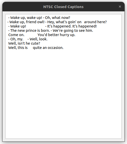 On some NTSC sources closed caption subtitle information is included. When the closed caption window is open it is possible to scroll through a contiguous sequence of frames (using the next frame button) - if CC information is present it will be typed out into the closed caption window. Text in the CC window can be cut and pasted into another application if required. For export of closed-captions from the entire source please see the ld-export-metadata tool. Note that skipping over more than a single frame will automatically clear the CC output window.