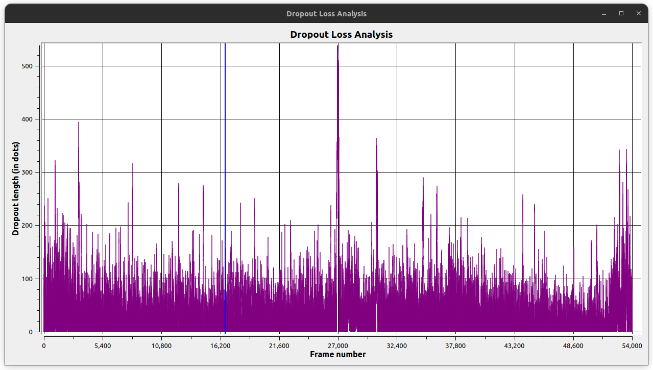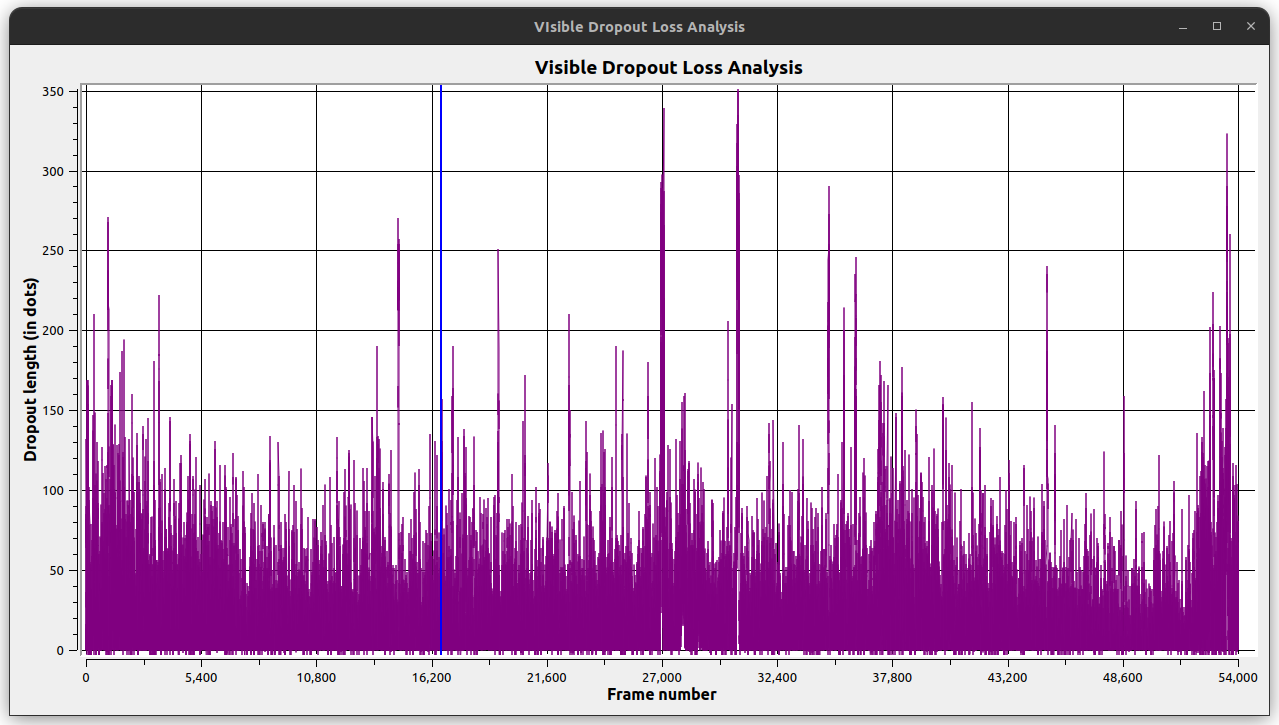 The dropout analysis window shows a graph of dropouts detected in the whole TBC file. The dropouts are averaged over multiple fields to simplify the view (the number of fields used per average increases as the total number of fields increases). The graph shows the dropouts on the X axis (represented by the total length in picture ‘dots’ of all detected dropouts in the field) and the field number on the Y axis: