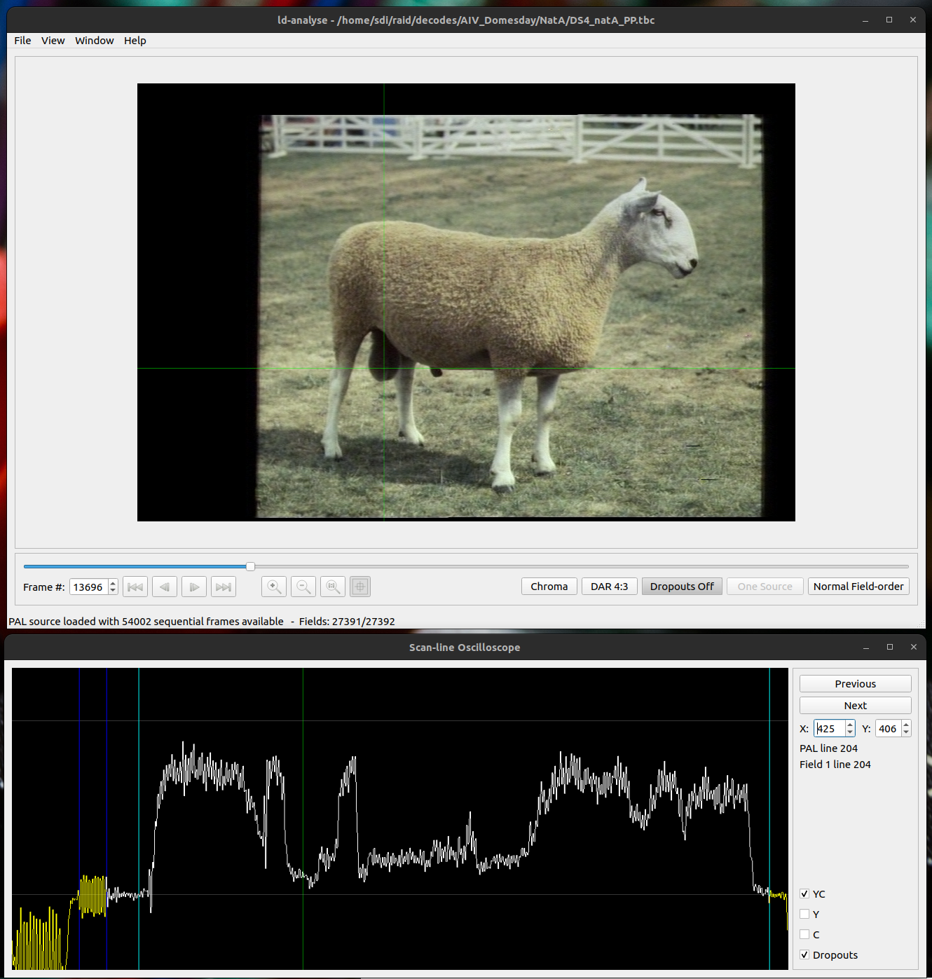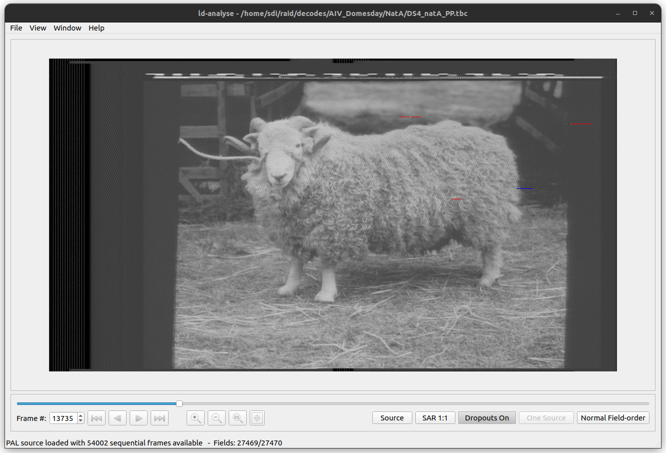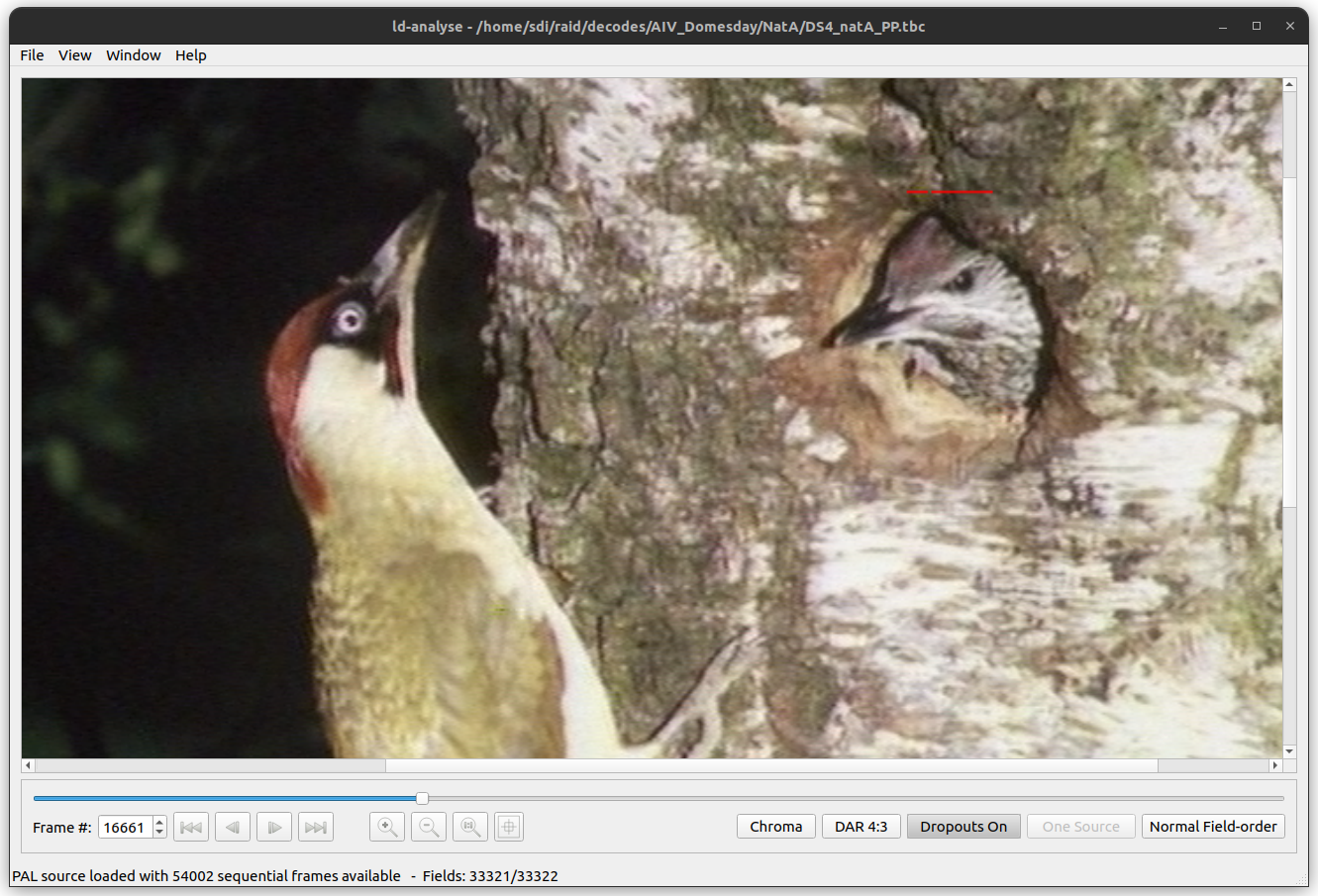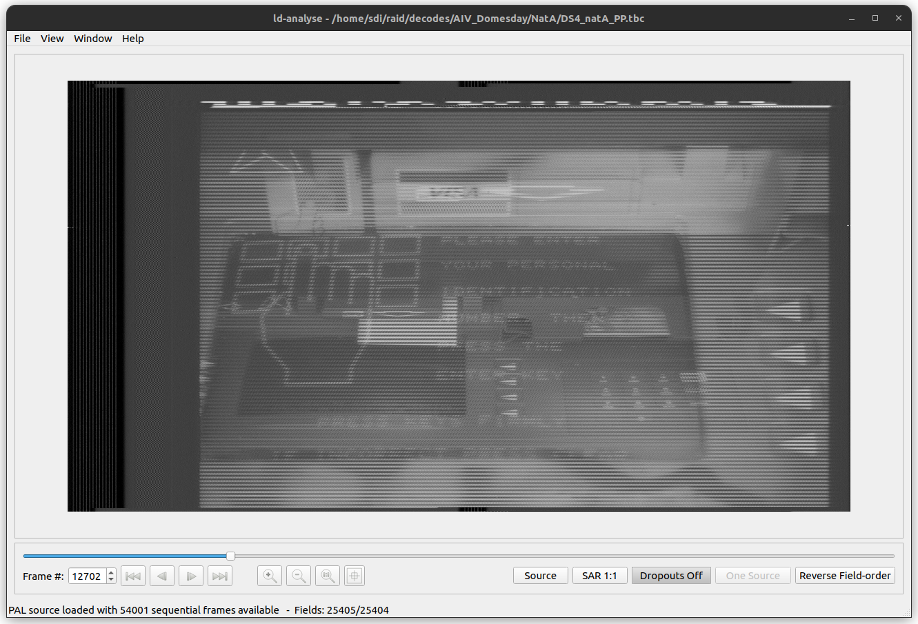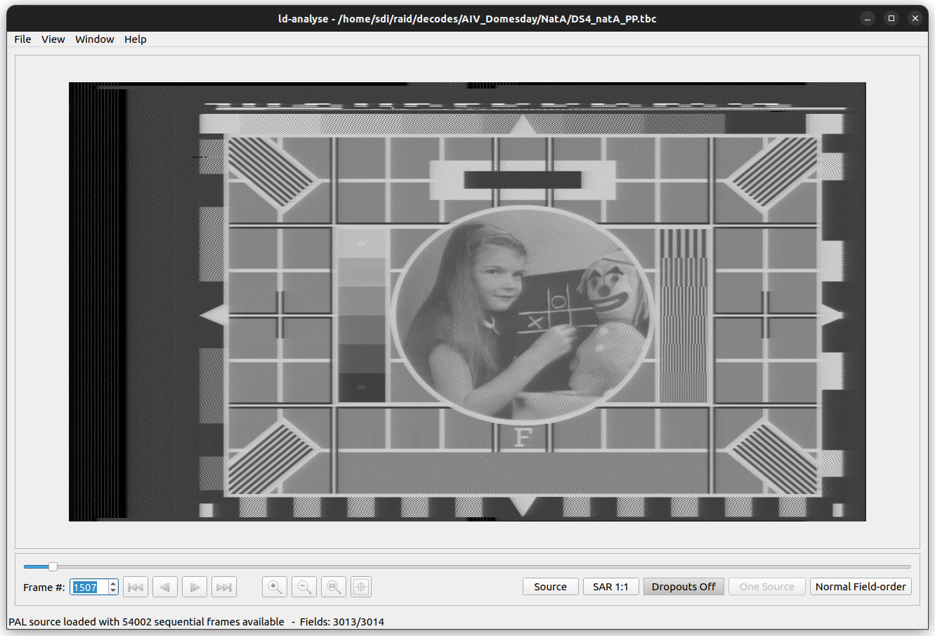 Some sources are mastered with the expected field order reversed. This causes ld-analyse to combine the wrong fields and the resulting frame is a mix of two adjacent frames. Clicking on the ‘Normal Field-order’ button reverses the displayed field order:
