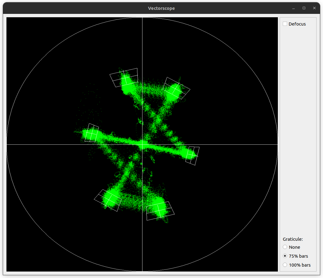 The screenshot below shows 75% PAL colour bars on the vectorscope. These are correctly adjusted – the blobs for the colours land in the centre of the graticule targets: