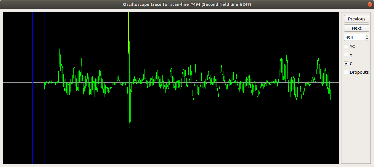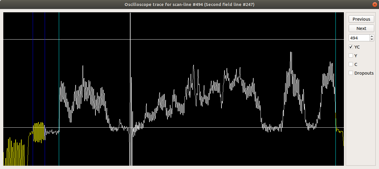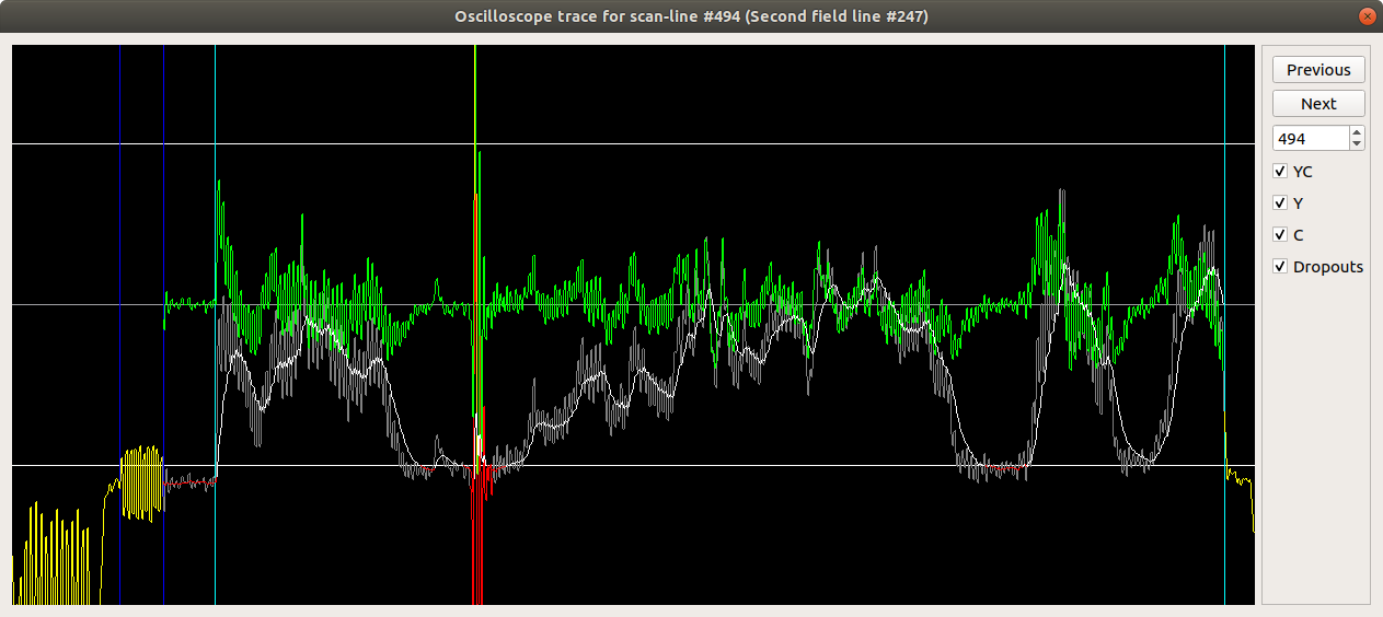 The YC tick-box shows the combined Y (Luminance) and C (Chrominance) values (the combined YC signal is the actual signal present in the original TBC video):