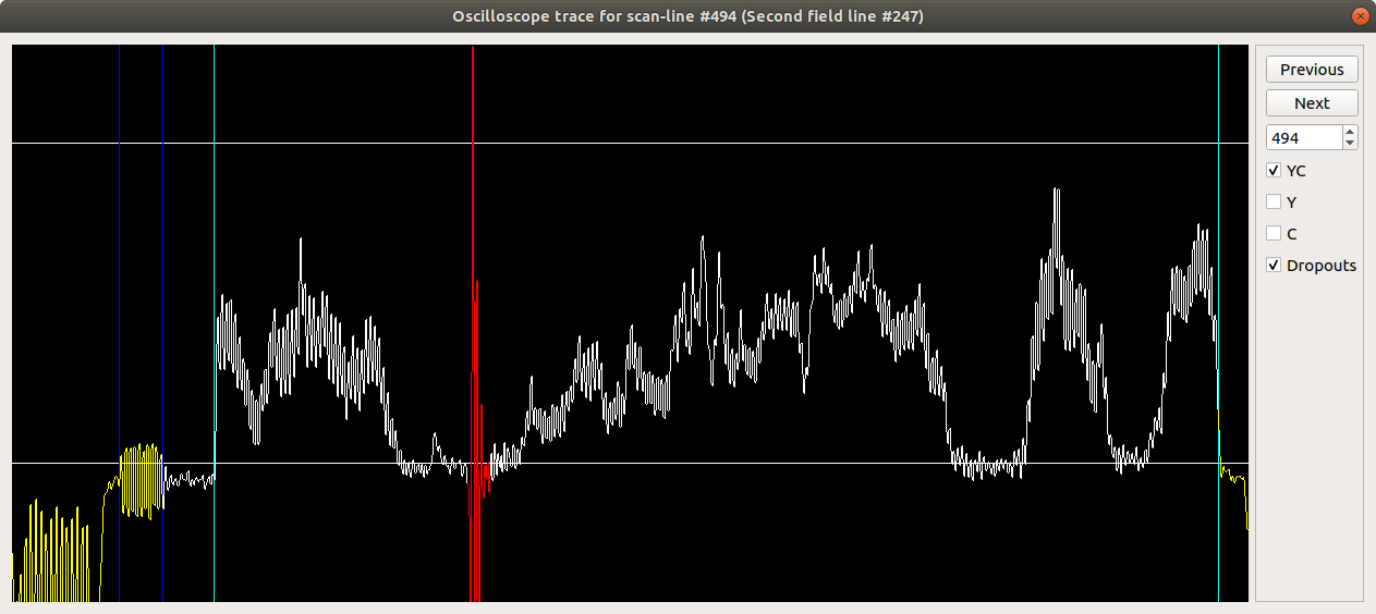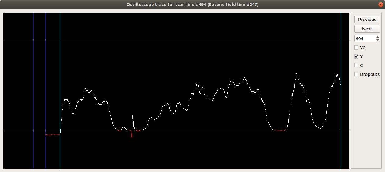 Dropouts are temporary losses of signal caused by dirt, damage, scratches or other defects on the originally sampled LaserDisc or other source media. ld-decode detects areas of dropouts during the decoding process. These detected areas are shown in the currently selected frame. Red lines represent drop-outs in the first field of the frame and blue lines represent drop-outs in the second field.