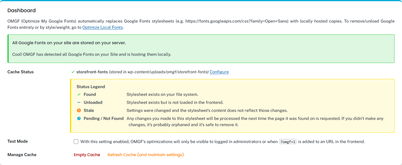- If OMGF was able to process all Google Fonts on your site, and if not; show you where they were found with possible solutions.