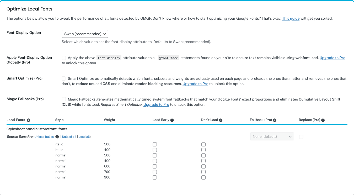 After you’ve completed configuring OMGF, the Optimize Local Fonts section will allow you to tweak all of your Google Fonts stylesheets by e.g., unloading unused fonts and/or preloading fonts above the fold.