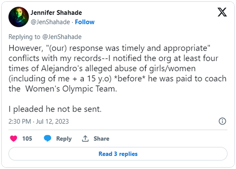 - On 11 July, Jennifer Shahade publicly challenged the accuracy of US Chess' final Ramirez statement (issued 24 May) in a Facebook post, writing that the third party's (*) conclusion that US Chess' response to the Ramirez allegations was timely and appropriate "doesn't dovetail with my records, in which I notified US Chess at least four times about Alejandro's alleged misconduct against girls and women [...] including his assaults against me...and pleaded they not send him there." The next day, she posted a similar message on Twitter. (* This entry originally referred to "US Chess' conclusion...." Since publication this has been amended to "third party's conclusion..." to clarify the intended meaning and avoid possible misinterpretation.)