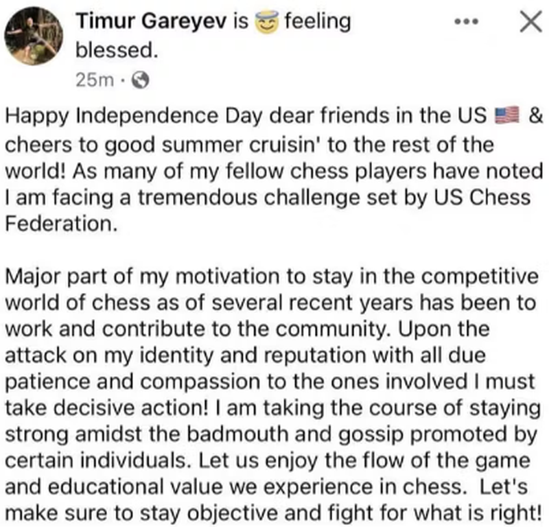 - On 4 July, Gareyev posted a message on Facebook in which he claimed to be facing "a tremendous challenge set by US Chess" as well as an "attack on [his] identity and reputation" that he characterized as "badmouth and gossip promoted by certain individuals."
