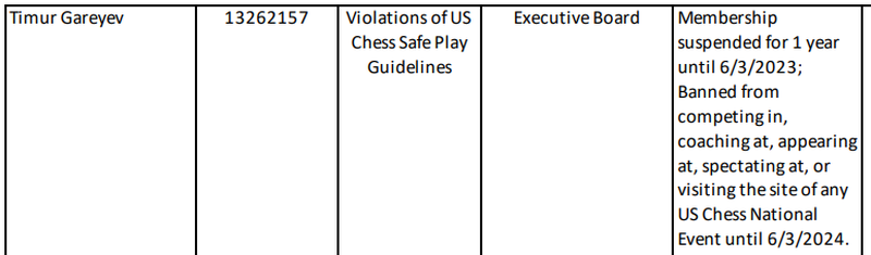 - In June, the US Chess Executive Board imposed sanctions on Gareyev -- suspending his membership for one year and banning him from attending or participating in US Chess National Events for two years. In notifying a complainant about the sanctions, US Chess stated that they considered the matter to be confidential and asked the complainant to "handle this information with the sensitivity it deserves." (Lichess)