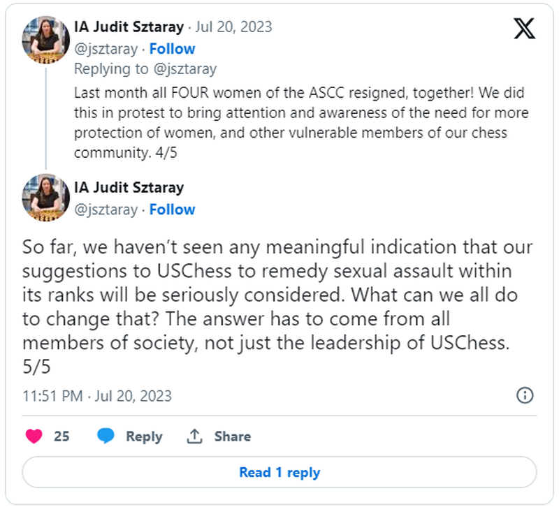 "I believe US Chess has a blind spot when it comes to dealing with titled players. For most of the cases I saw involving sexual allegations, US Chess moved swiftly to suspend US Chess membership and/or take other measures against alleged offenders. However [...] regarding titled players, things often take longer which can potentially increase the number of potential victims. I also feel the 2023 statement by US Chess is misleading and continued evidence of the blind spot they have in these matters. US Chess is generally an excellent organization with a vibrant chess culture. The staff who work there are amazing and implement policy, but they do not shape the policy (that is the job of the Executive Board). I hope my voice contributes toward positive change within US Chess."