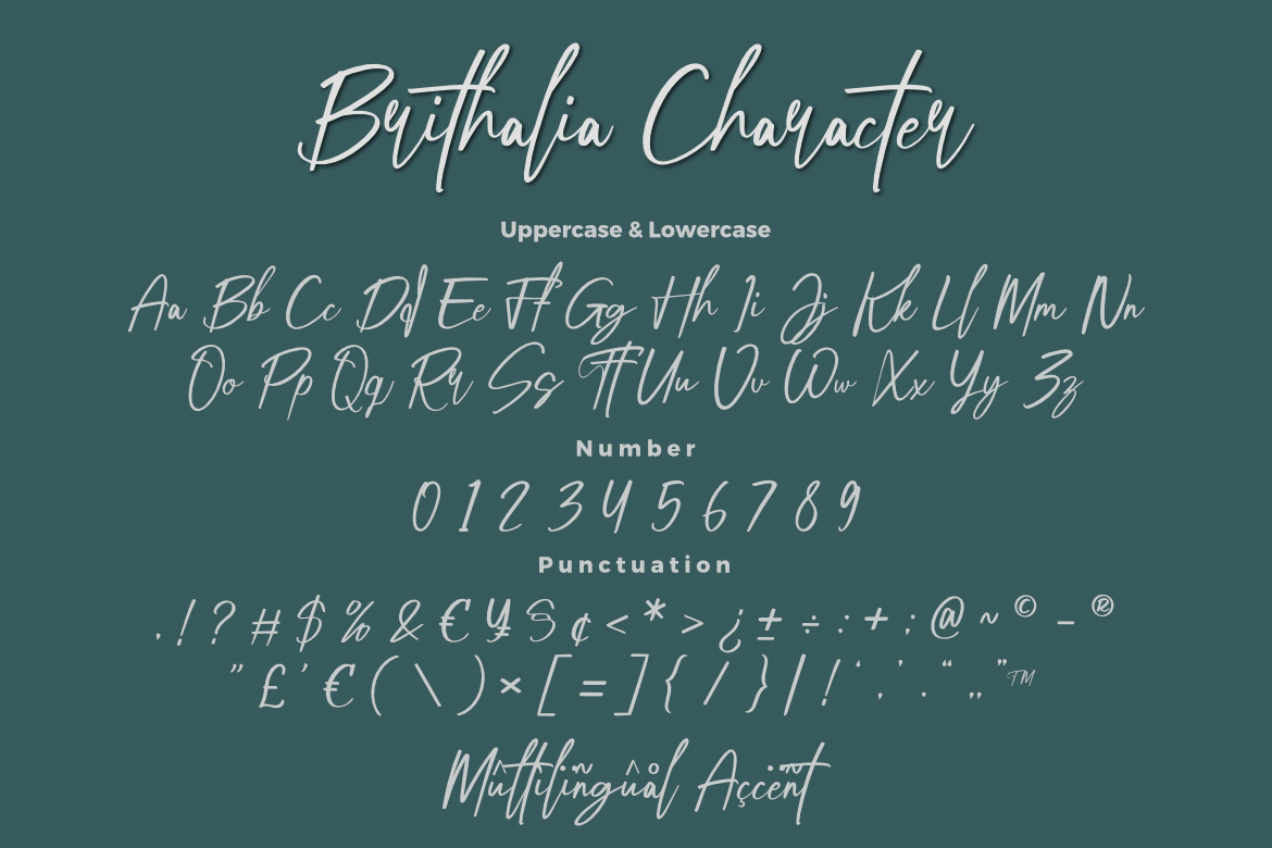 Each letter dances naturally with refined movement, reflecting the art of personal touch and authentic handwriting. Ideal for branding, fashion logos, invitations, and lifestyle projects, Brithalia adds a soft yet confident statement to your creative work.