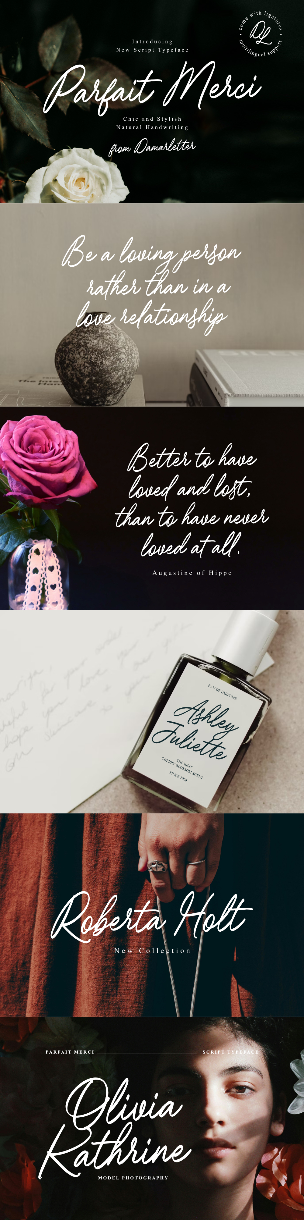 Parfait Merci is a chic and stylish natural handwriting script font that exudes elegance and sophistication. With its fluid, organic strokes and impeccably balanced letterforms, this font captures the essence of effortless style and refined handwriting. Perfect for projects that require a touch of modern luxury, Parfait Merci brings a sense of grace and poise to every design.