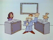 "Name That Food" is a one-shot animated game show hosted by Don Carrot. The goal is to identify the food on the board *and*... "Will you eat it?" Contestant #1 Debbie wins every round through her willingness to eat nutritious foods. While the second male contestant identifies three of the foods, he is appalled by the thought of eating liver and squash (which Debbie eagerly consumes, whole and evidently raw) and hesitant about spaghetti and meatballs ("I never have before...") The announcer reads off a long list of foods which all contestants receive, including a pound of gouda cheese.