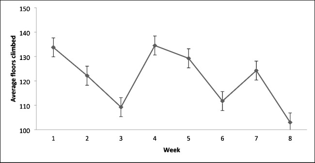 Results: On average, the experimental group climbed 121 floors/week when prompted. There were significant reductions in fasting blood glucose, TC and LDL, as well as the derived measures of 'bad' cholesterol and the TC/HDL ratio in the experimental group. Post-experimental interviews indicated that the interruption to sitting was well tolerated.