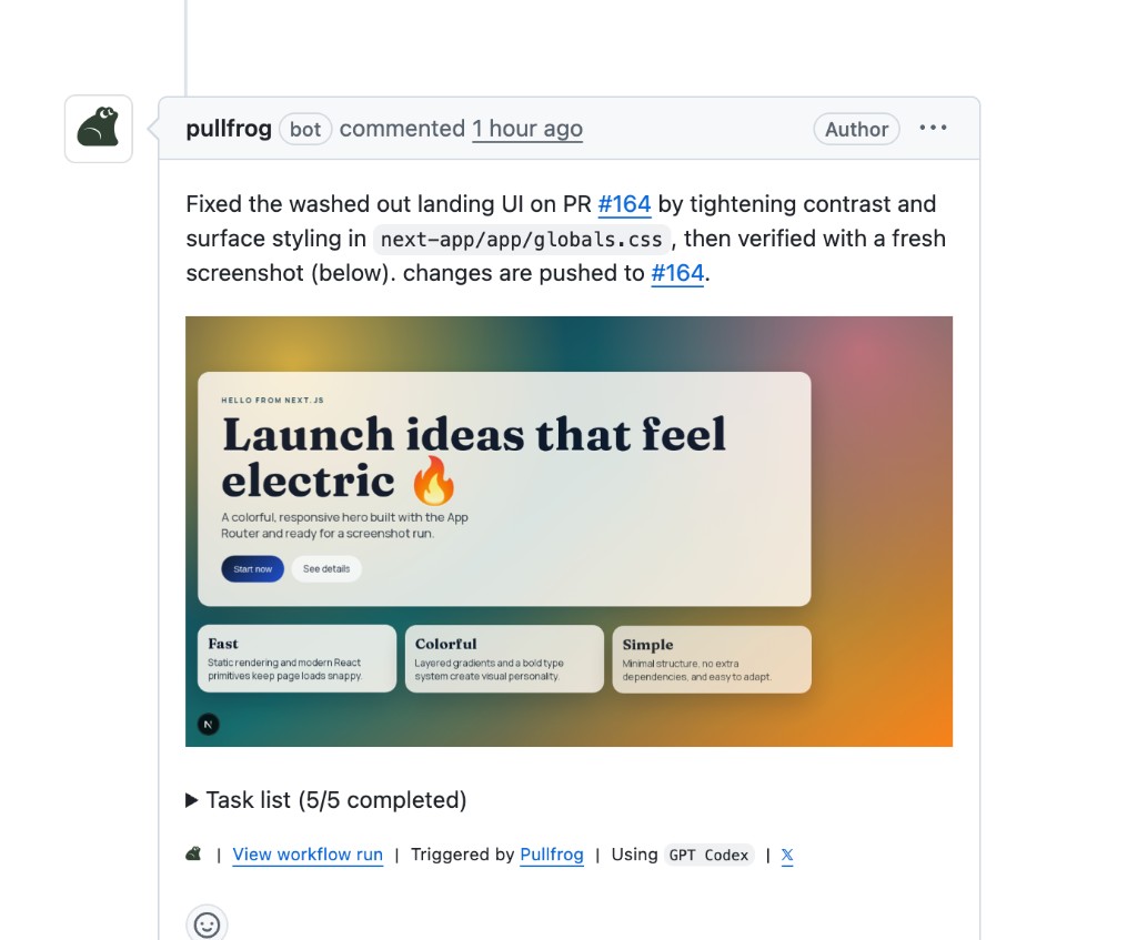 Like a good human colleague, Pullfrog detects CI failures on its own PRs and attempts a fix. It can be configured to attempt CI fixes on human-created PRs too.