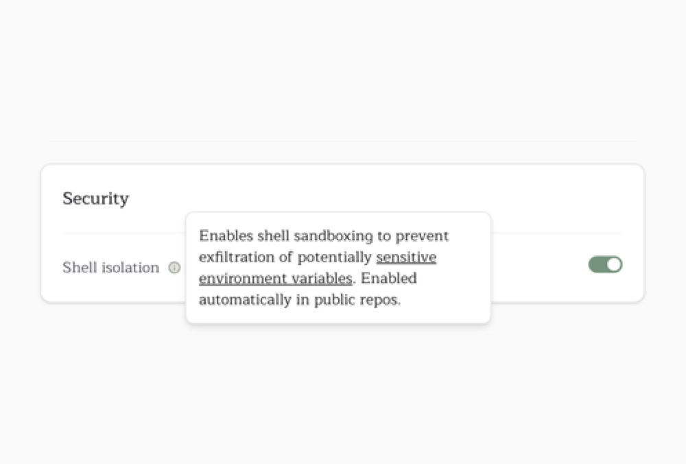 Shell commands are run in an isolated subprocess without access to sensitive environment variables. Git and GitHub operations go through a dedicated MCP server with permission checks — the agent can't push to protected branches or access repos it shouldn't.