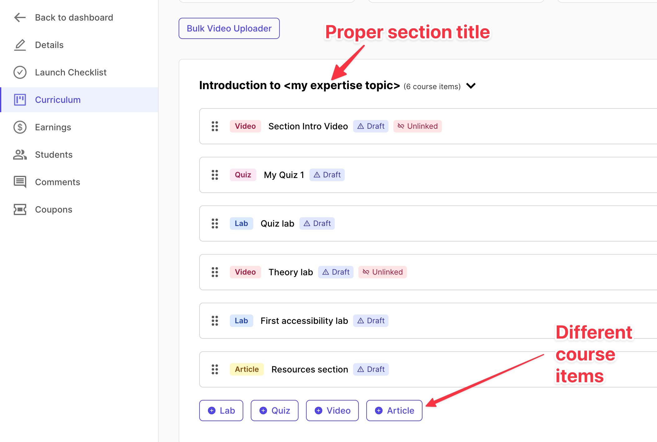 Your curriculum designer is the place where you will spend your most time. It is a powerful way to organize your course and break it down into multiple sections. We recommend every section to contain: