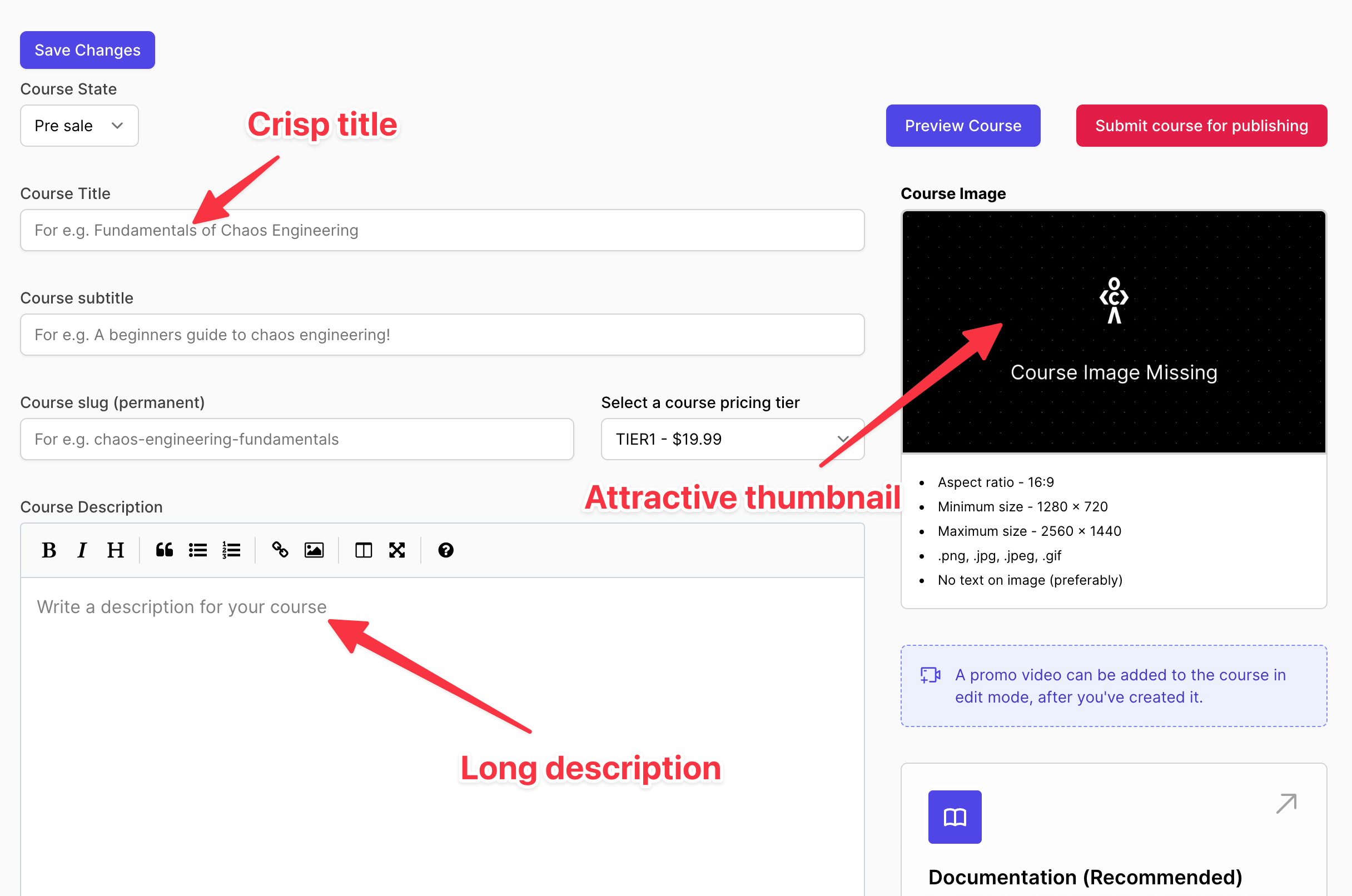 - Make sure your course description is lengthy and includes everything in detail that is the course outcome. What will the student learn? What will they become? What dream skills they unlock after going through your course?