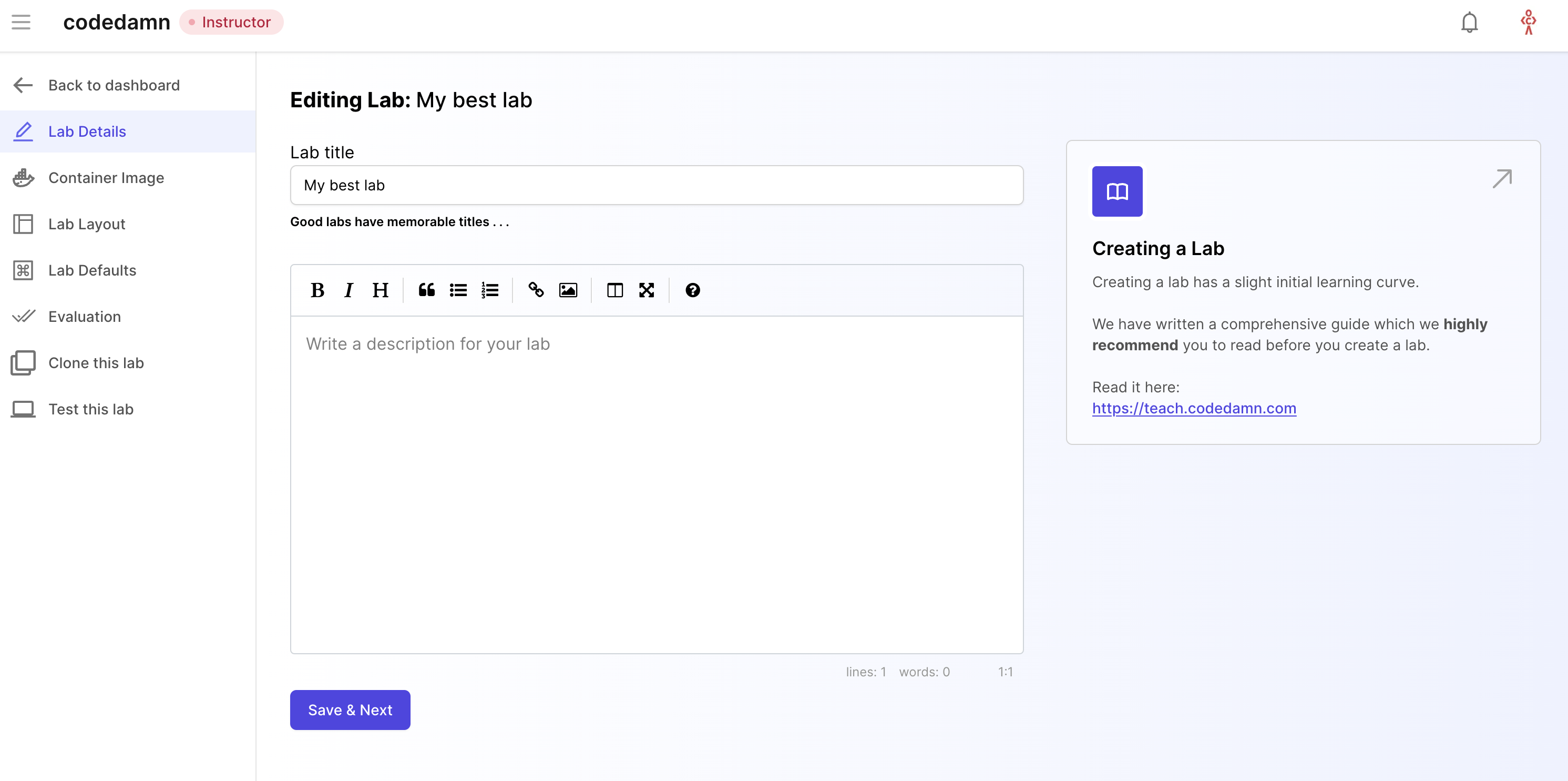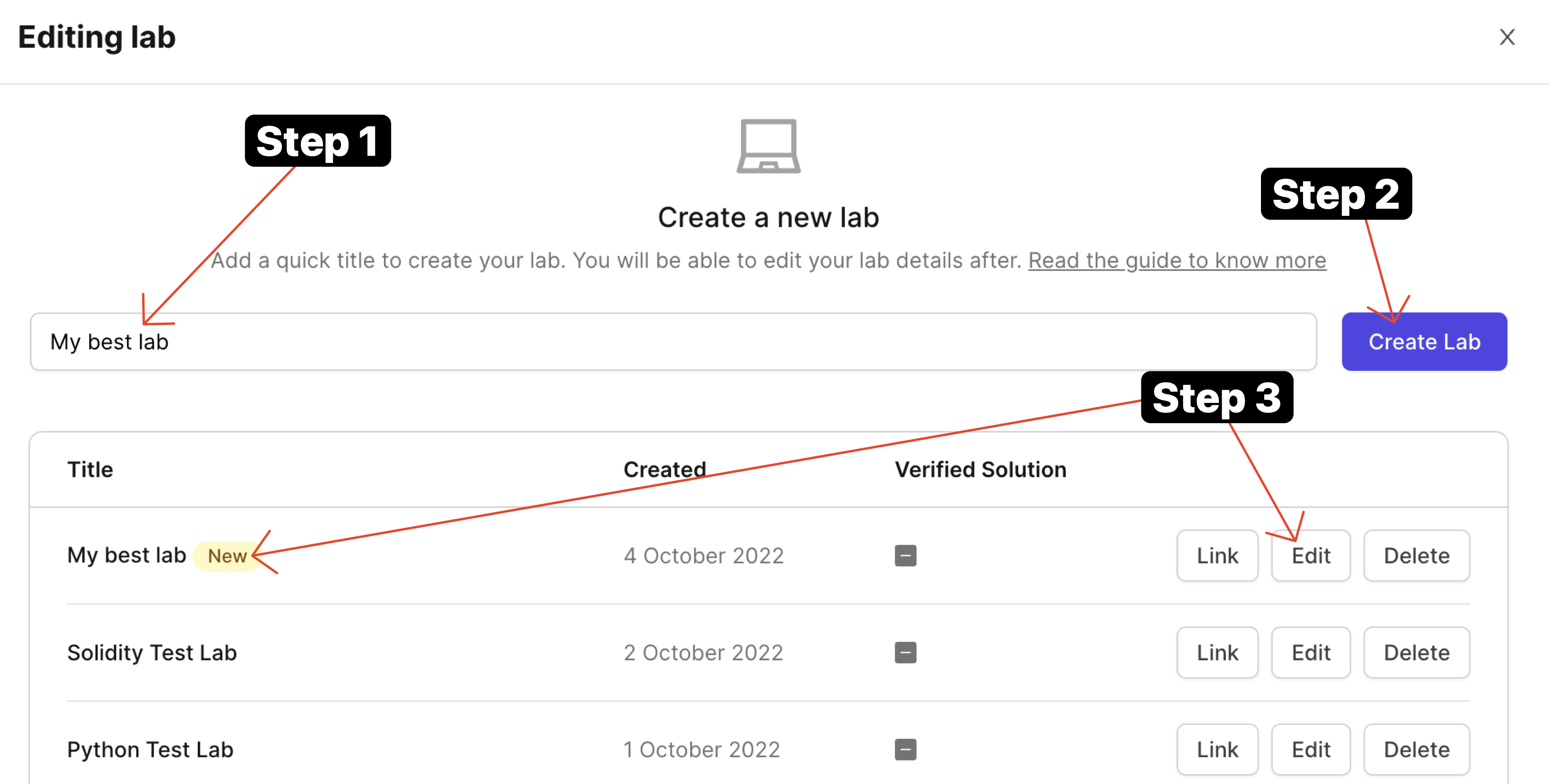 You should now be able to write a quick lab name and press on "Create Lab" button. This would create a lab you would be able to edit.